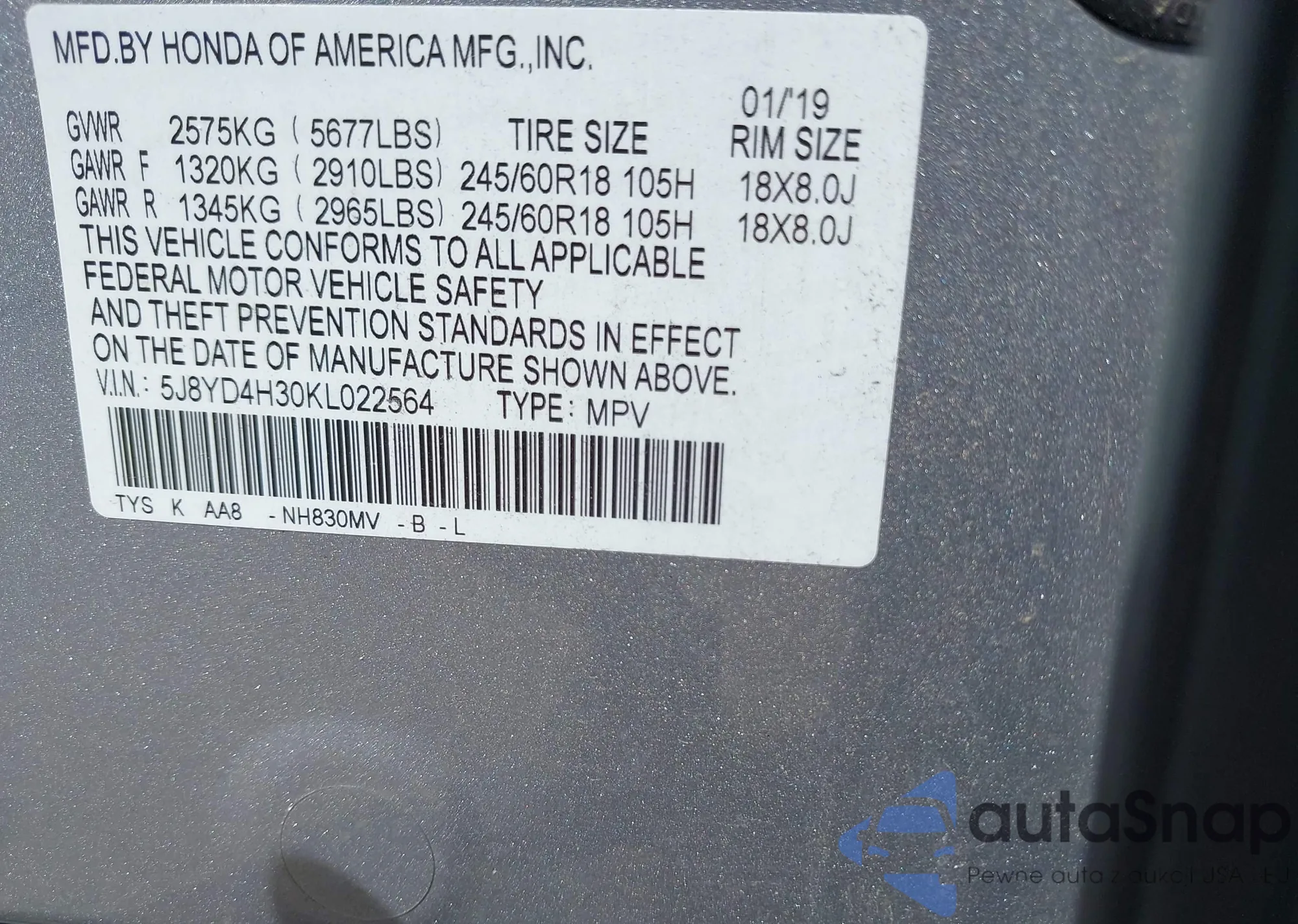 • VIN 5J8YD4H30KL022564