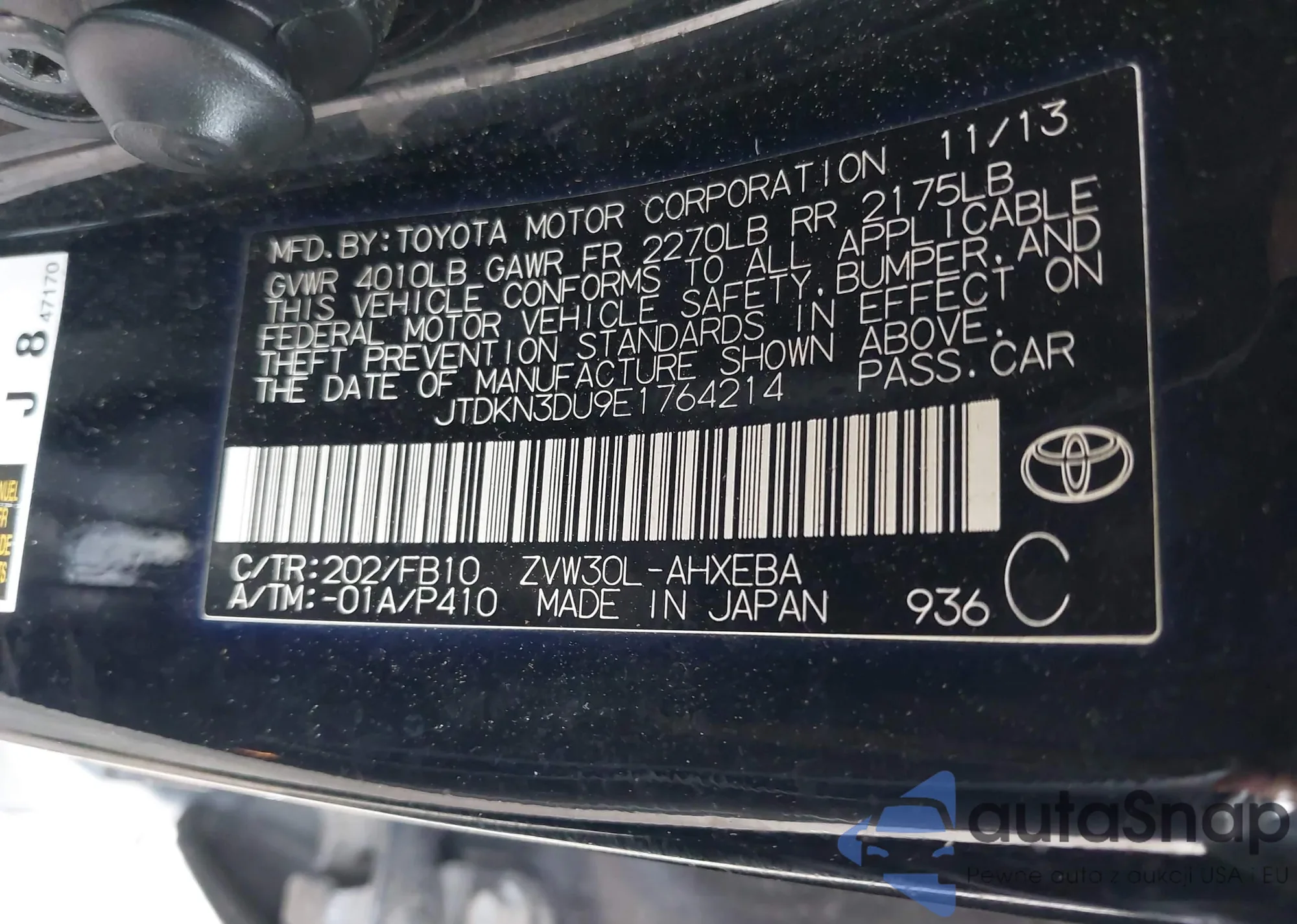 LOT: 42699066 VIN: JTDKN3DU9E1764214