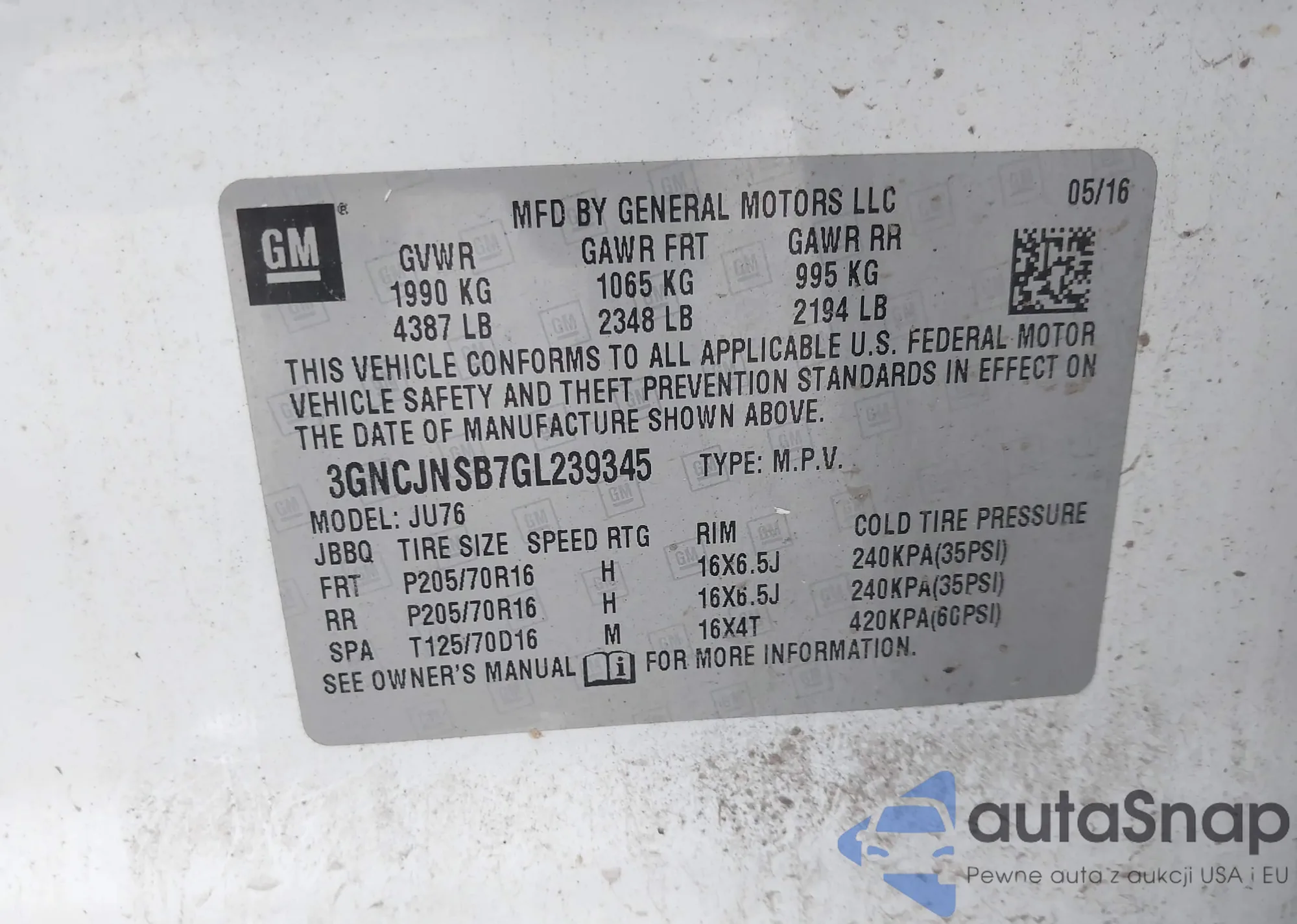 • VIN 3GNCJNSB7GL239345