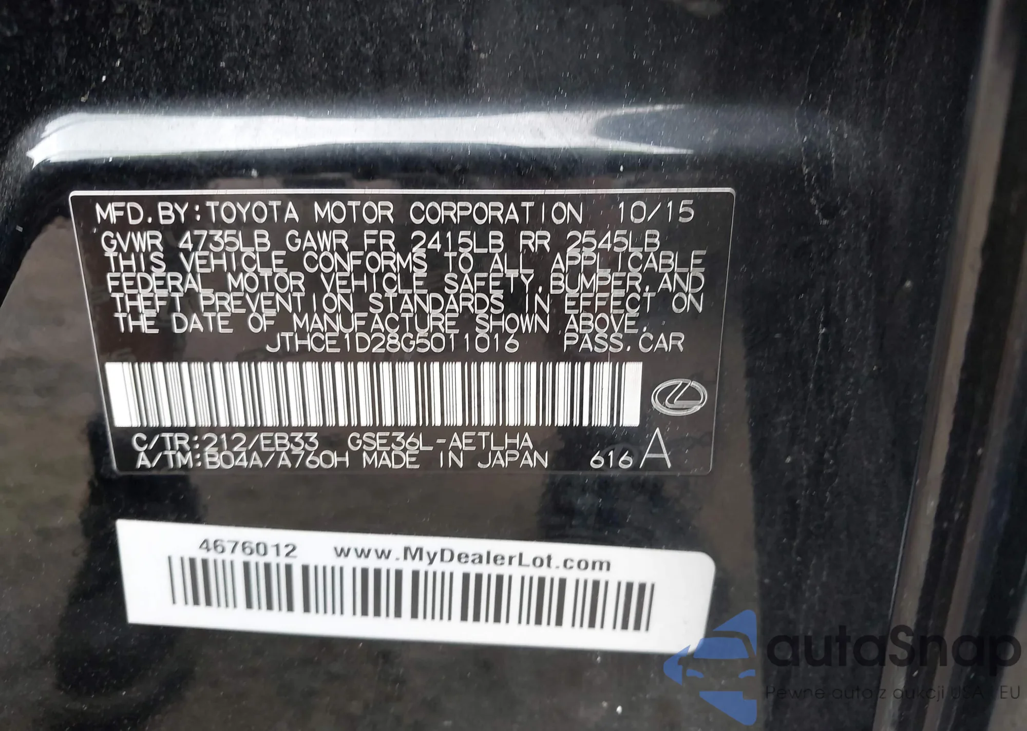 LOT: 42731758 VIN: JTHCE1D28G5011016