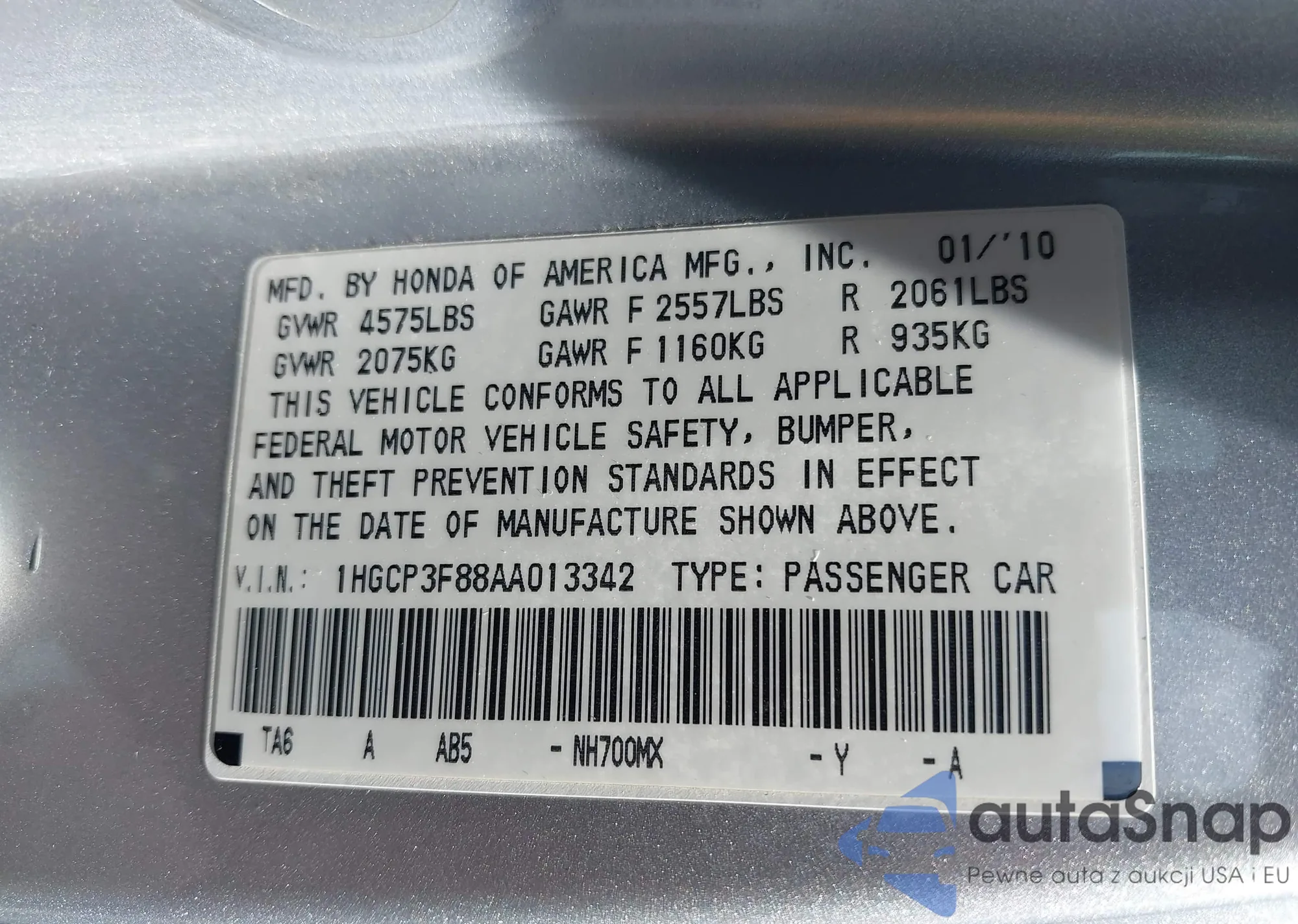 LOT: 42951966 VIN: 1HGCP3F88AA013342