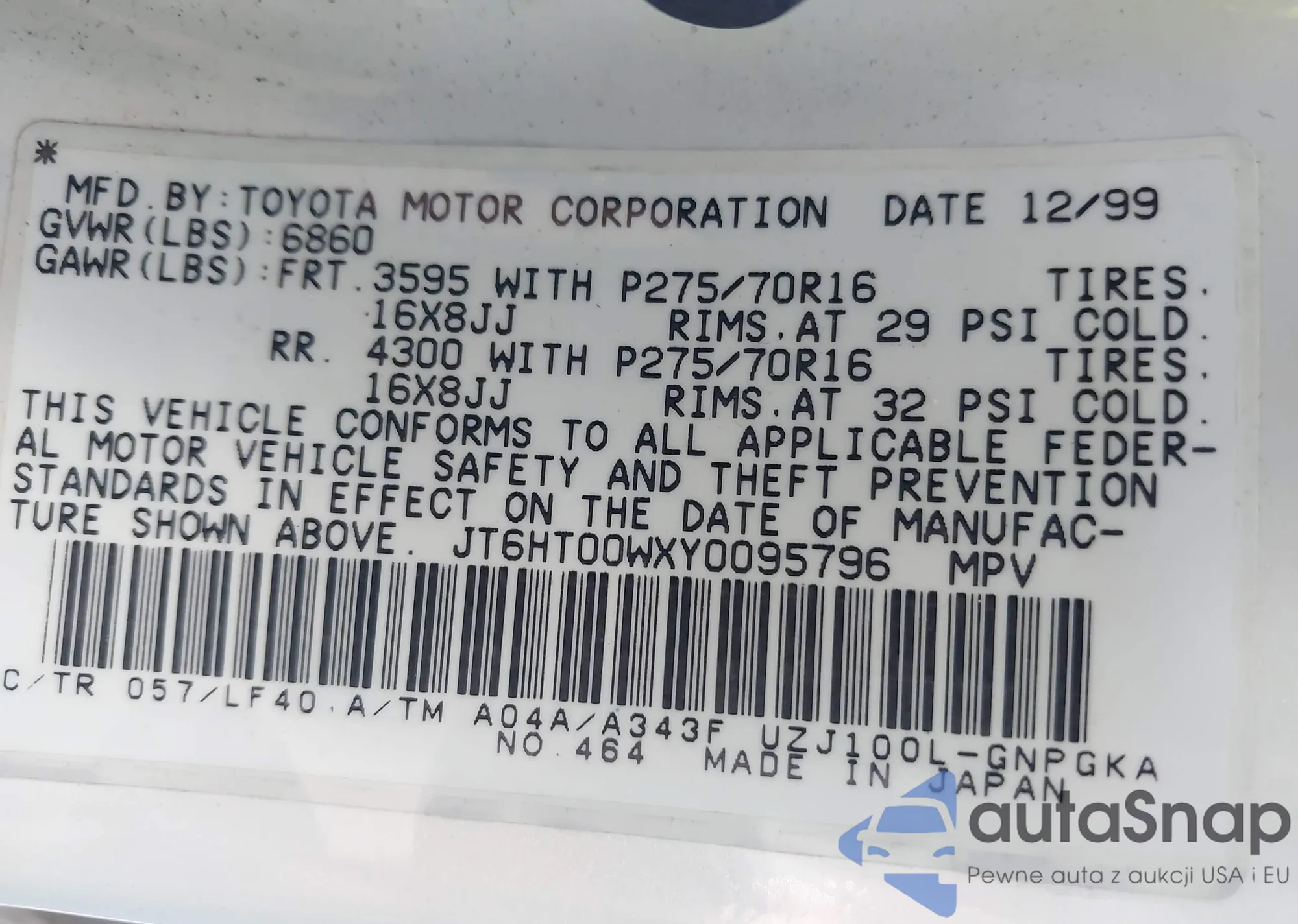 LOT: 43097928 VIN: JT6HT00W9X0056275