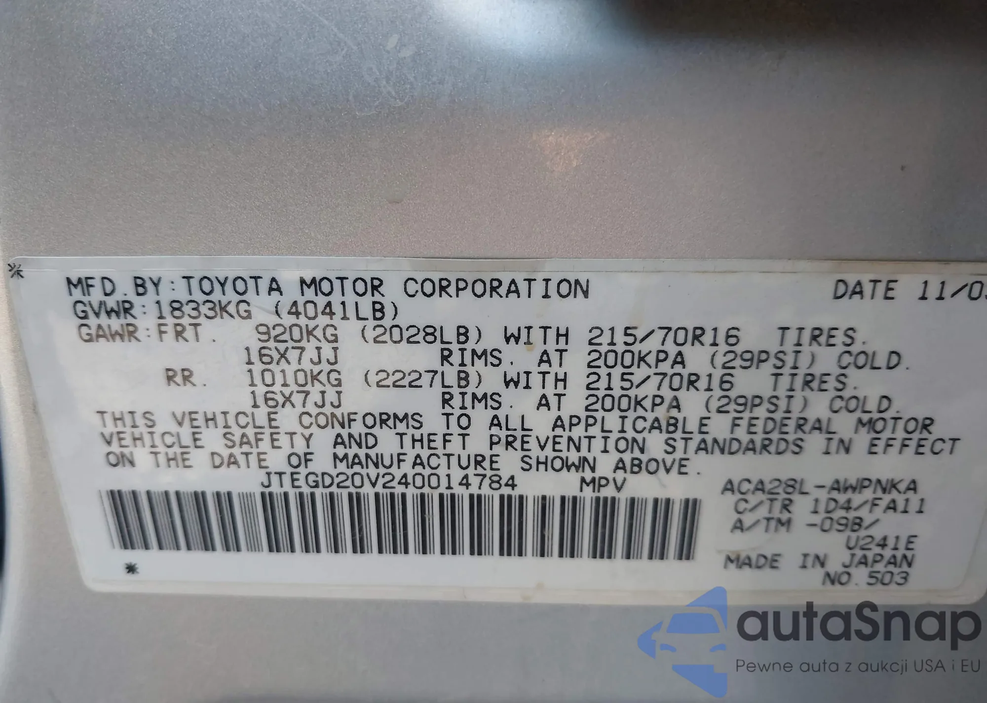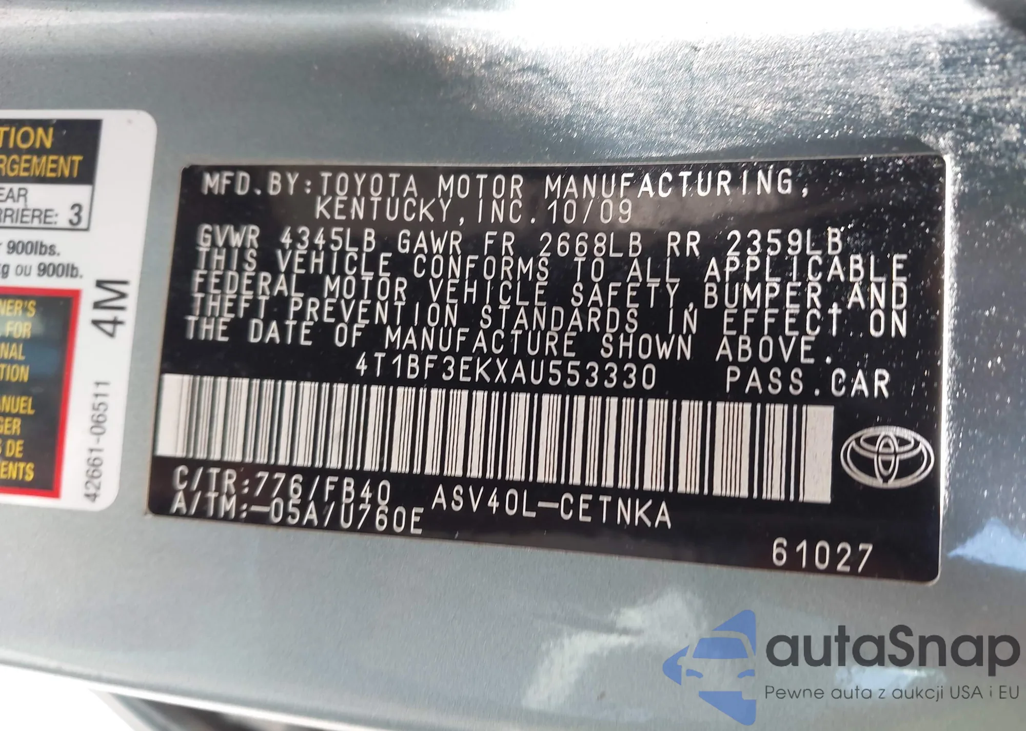 • VIN 4T1BF3EKXAU553330