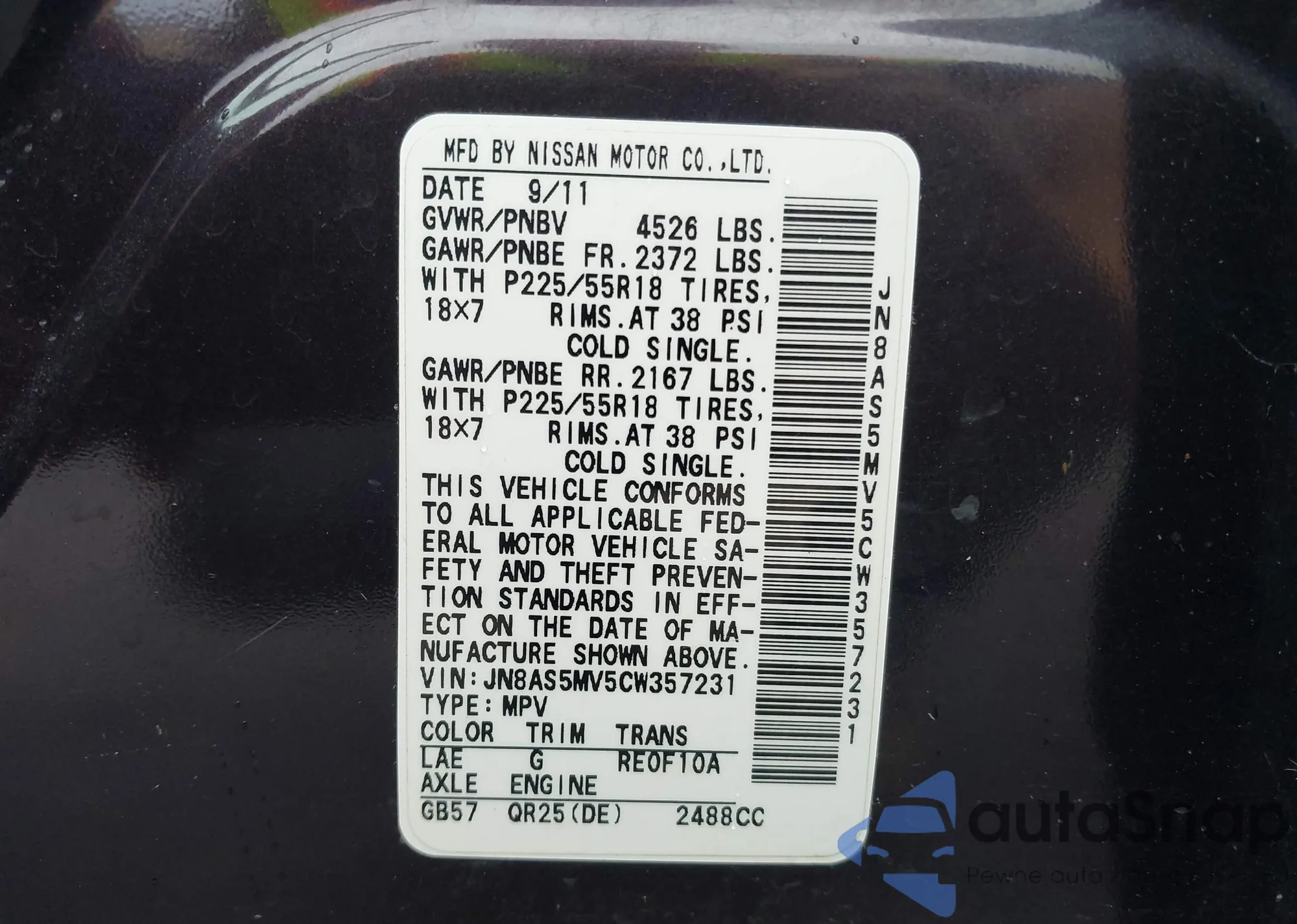 • VIN JN8AS5MV5CW357231