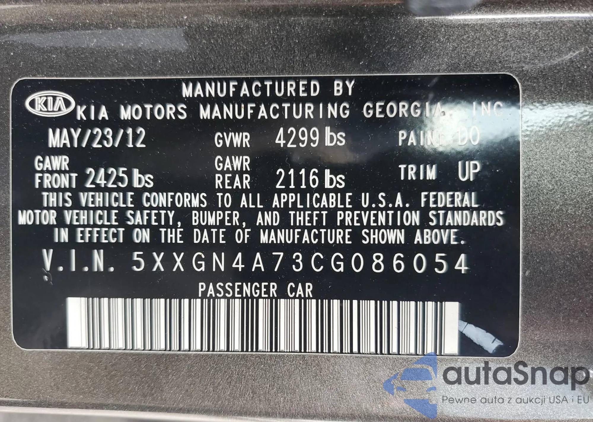 LOT: 63274705 VIN: 5XXGN4A73CG086054
