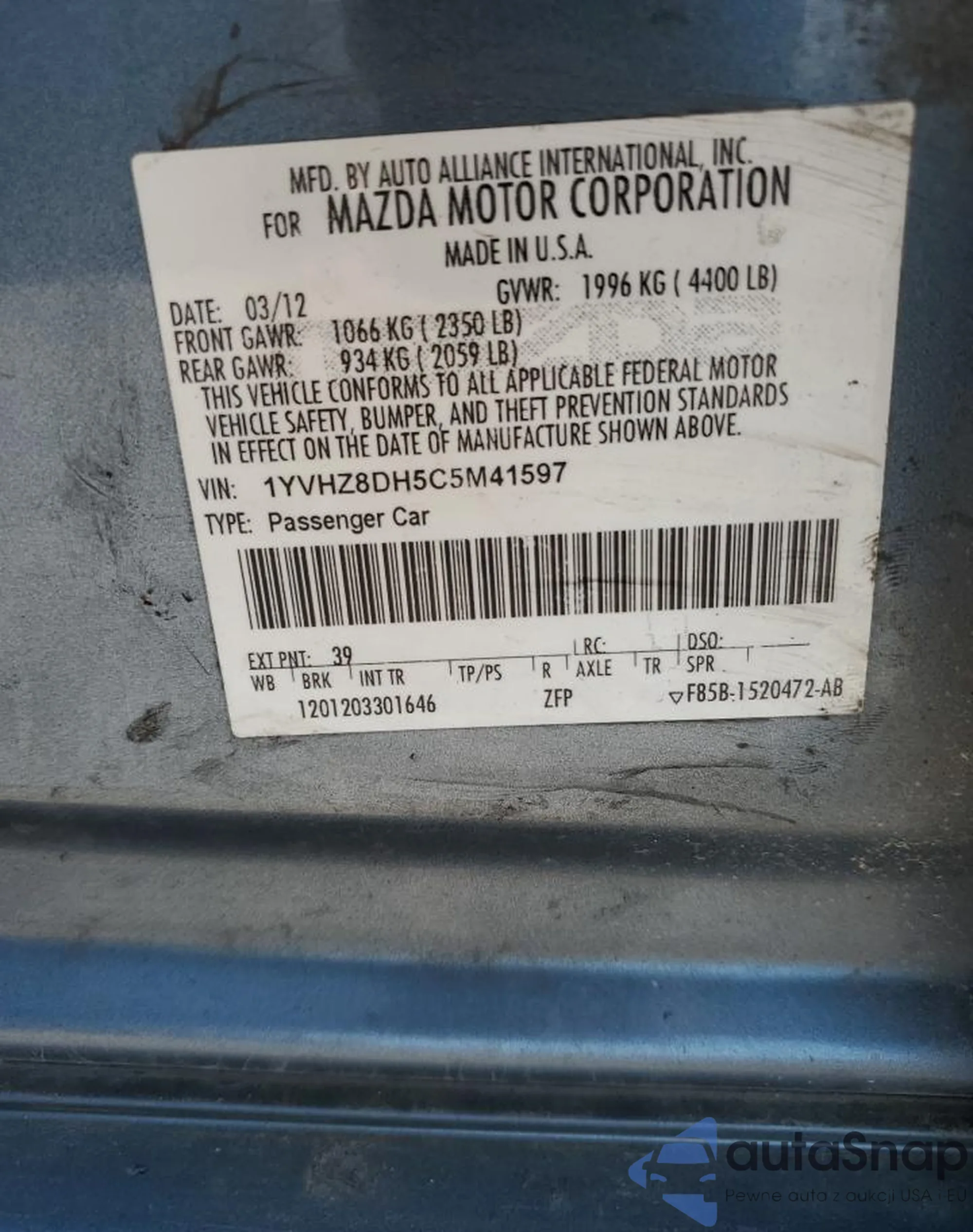 • VIN 1YVHZ8DH5C5M41597