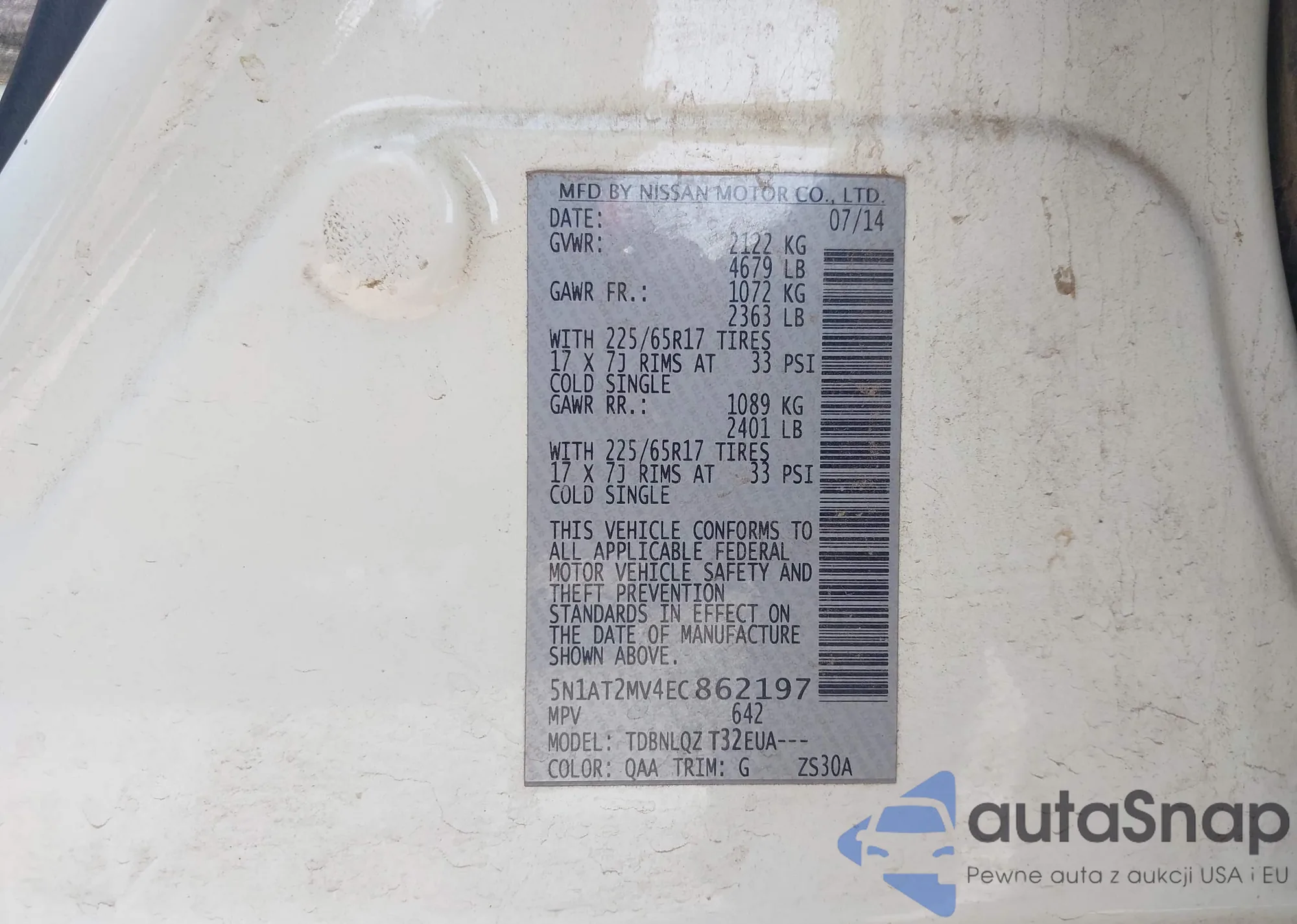 LOT: 42941870 VIN: 5N1AT2MV4EC862197
