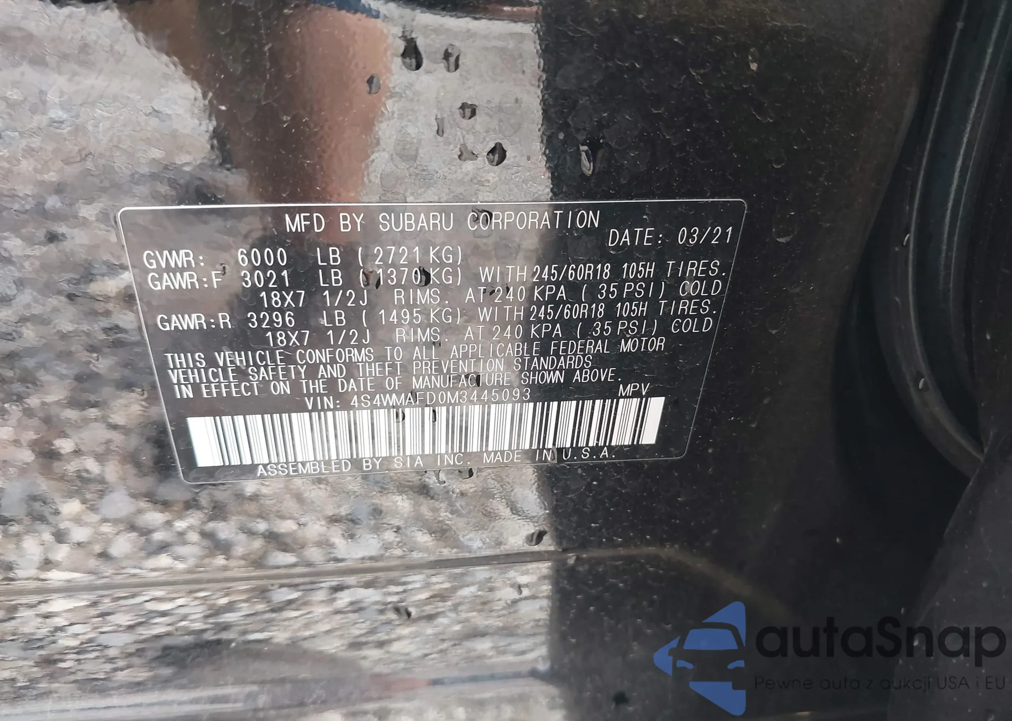 2021 Subaru Ascent Premium z USA, uszkodzony, nr VIN 4S4WMAFD0M3445093