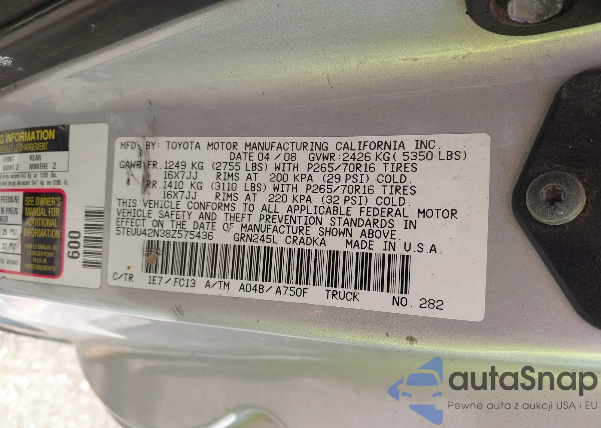 • VIN 5TEUU42N38Z575436