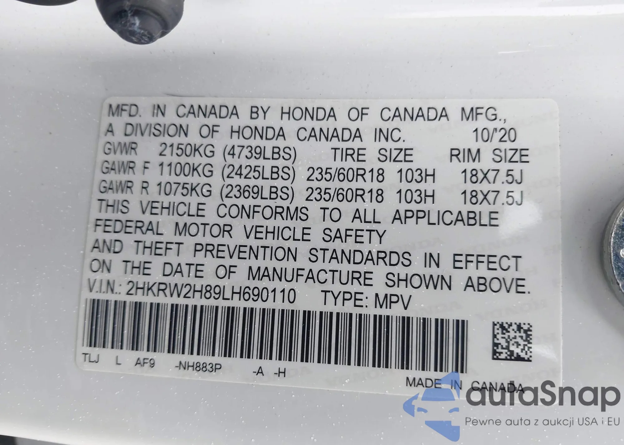 • VIN 2HKRW2H89LH690110