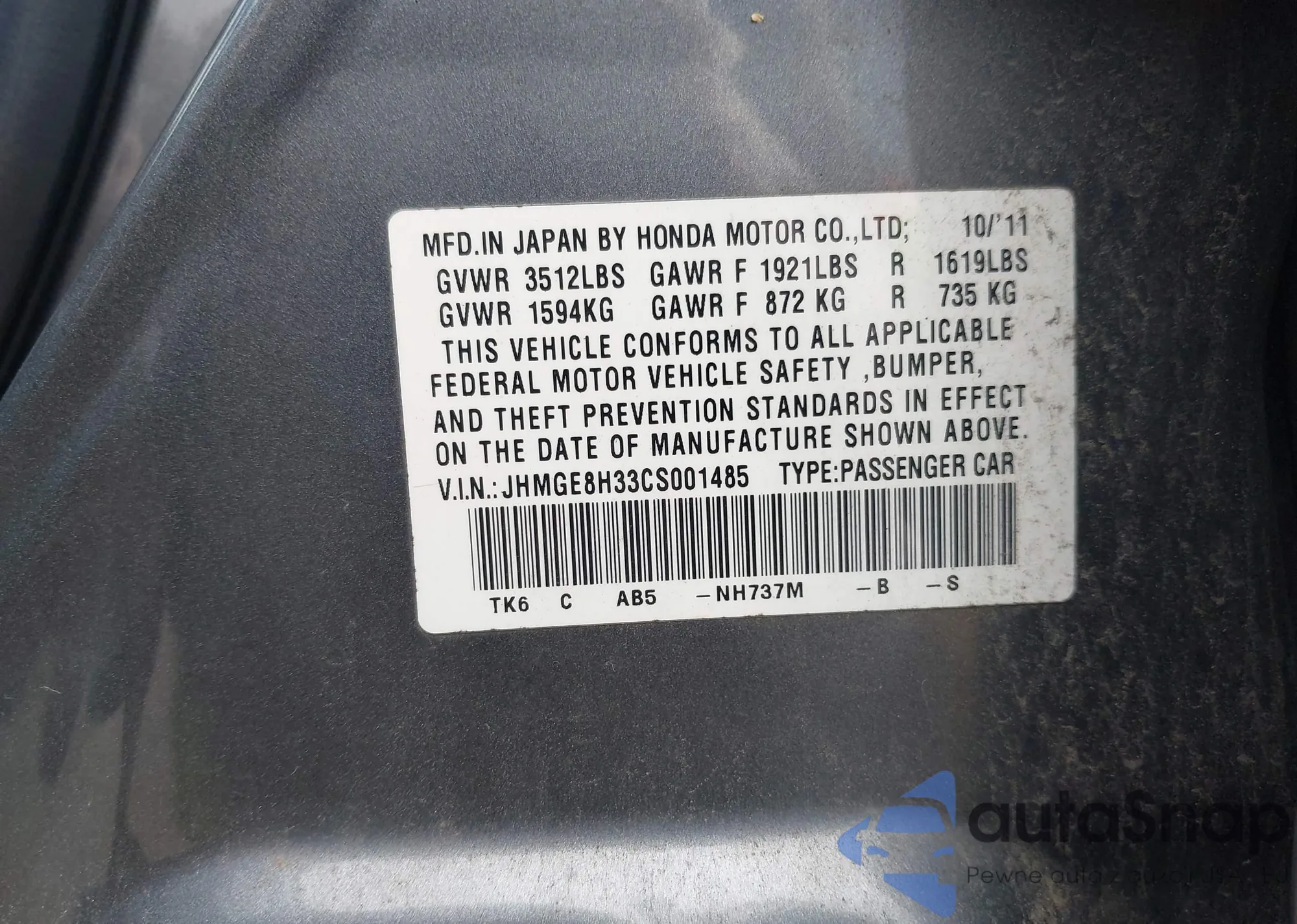 • VIN JHMGE8H33CS001485