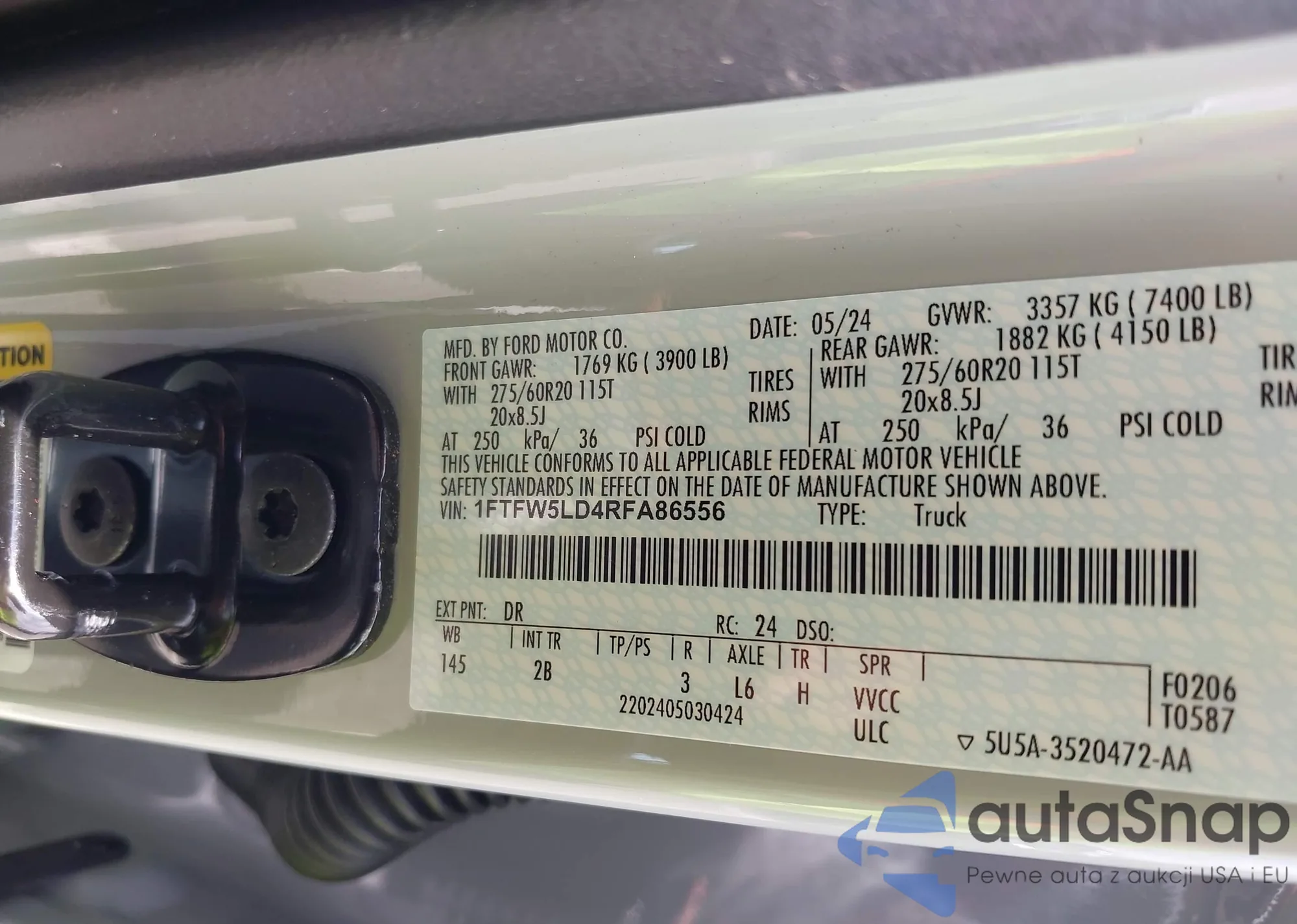 2024 Ford F-150 Lariat z USA, uszkodzony, nr VIN 1FTFW5LD4RFA86556