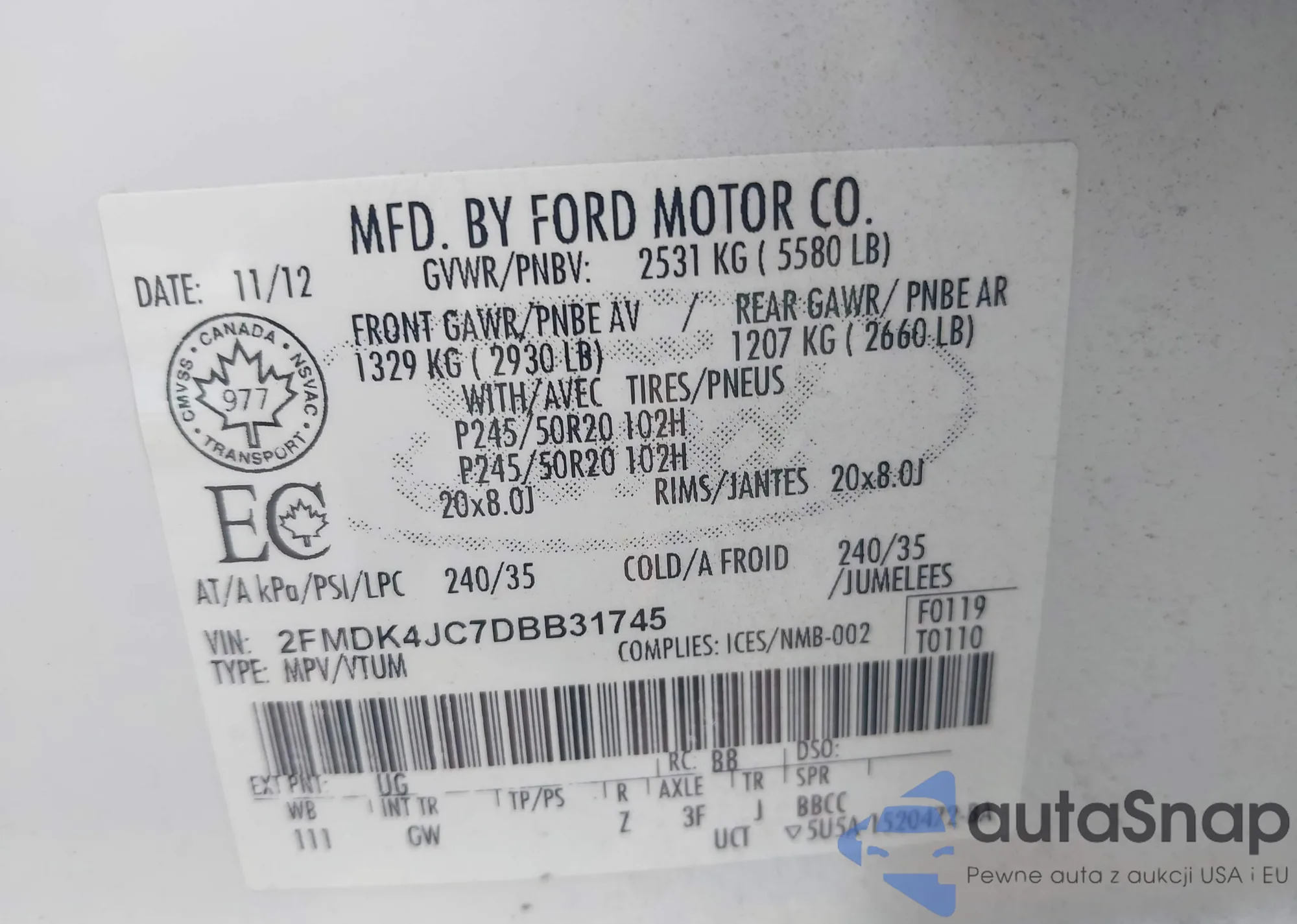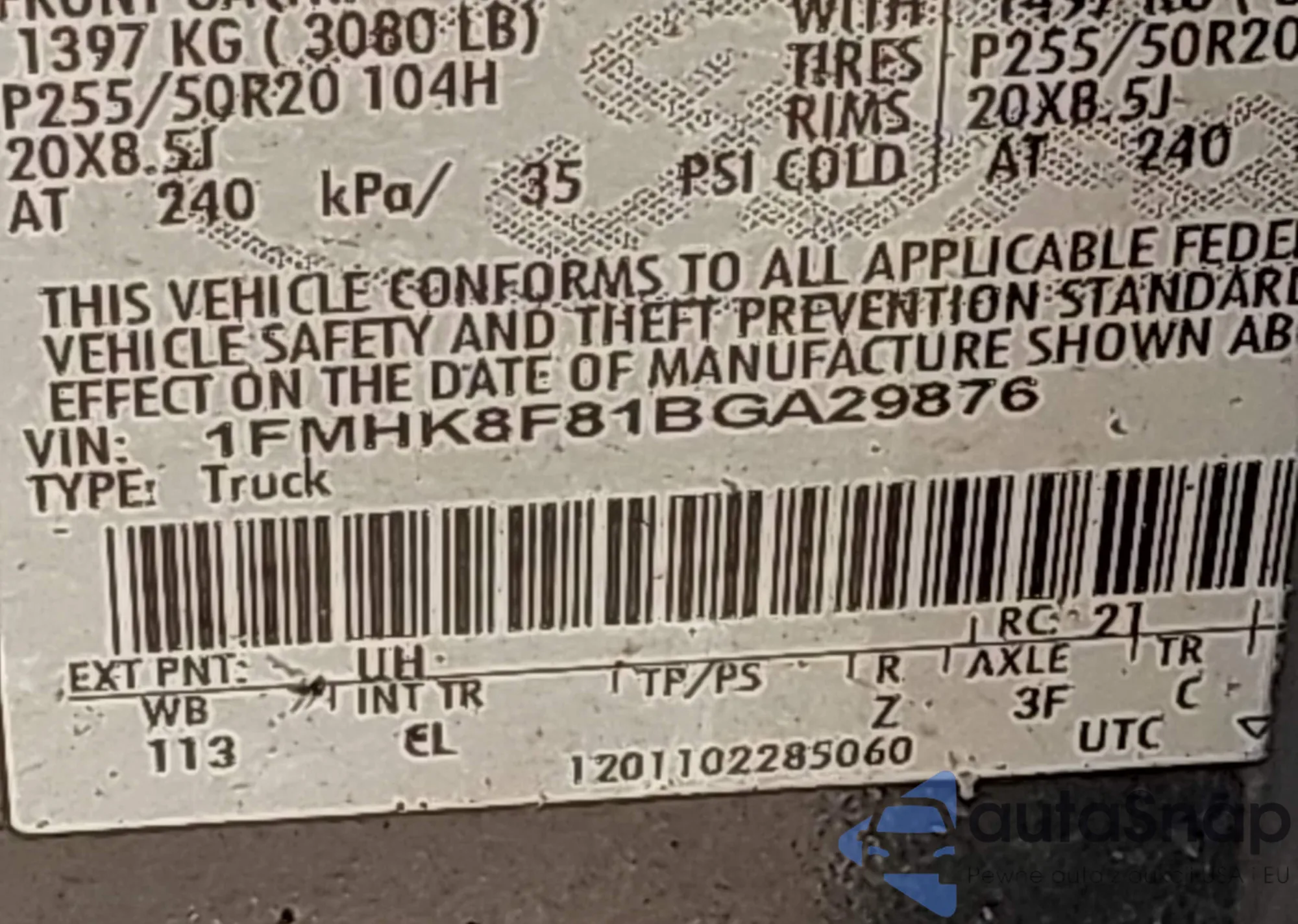 LOT: 43168248 VIN: 1FMHK8F81BGA29876