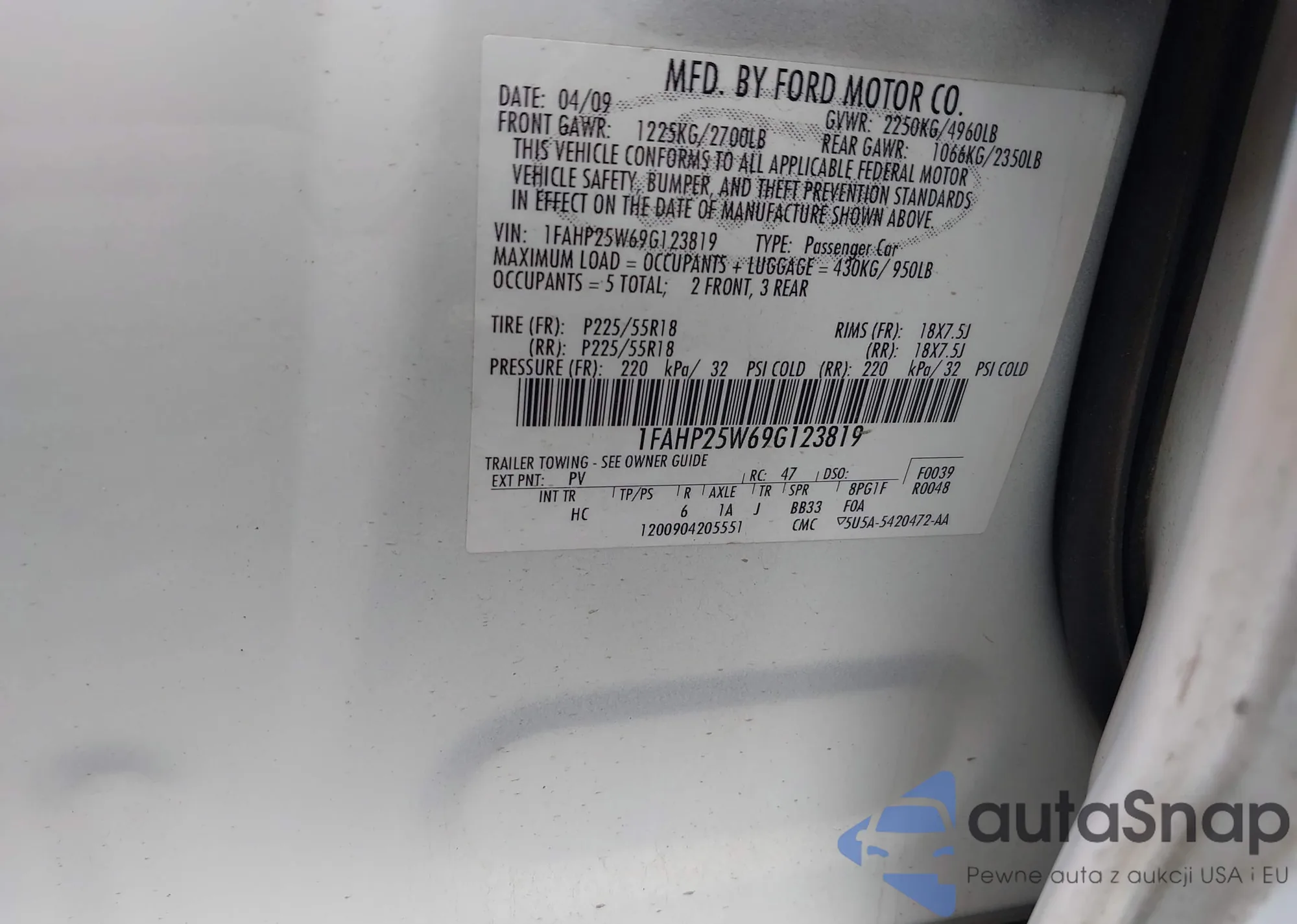 LOT: 42963443 VIN: 1FAHP25W69G123819