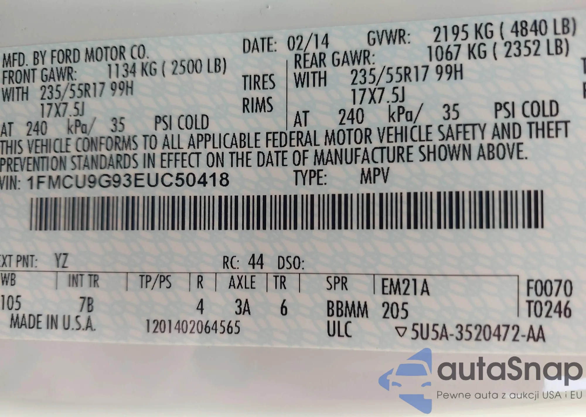 • VIN 1FMCU9G93EUC50418