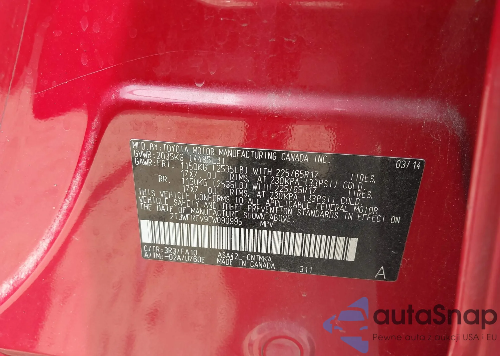 LOT: 43081934 VIN: 2T3WFREV9EW090995