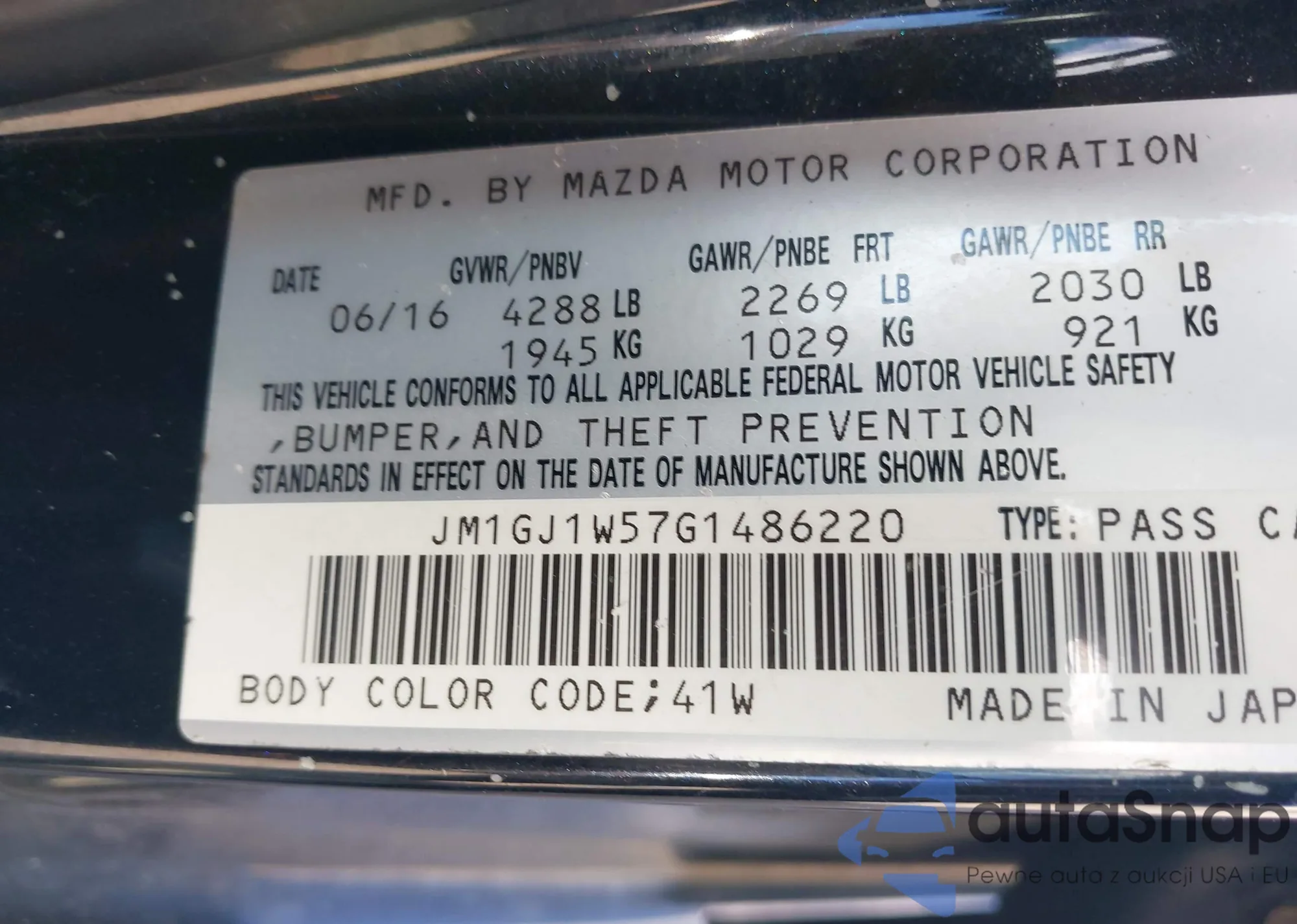 LOT: 43099036 VIN: JM1GJ1W57G1486220