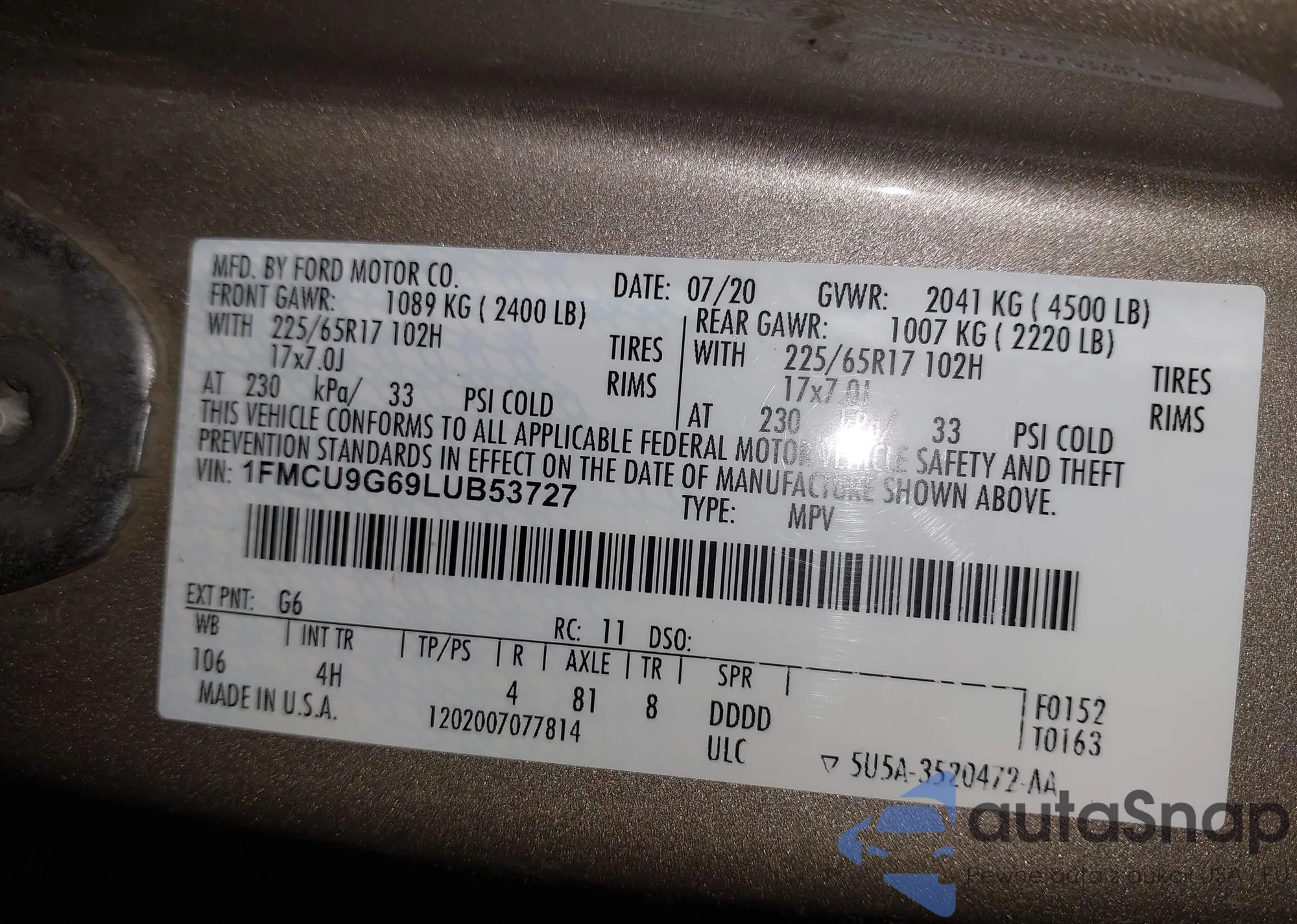 LOT: 42812546 VIN: 1FMCU9G69LUB53727