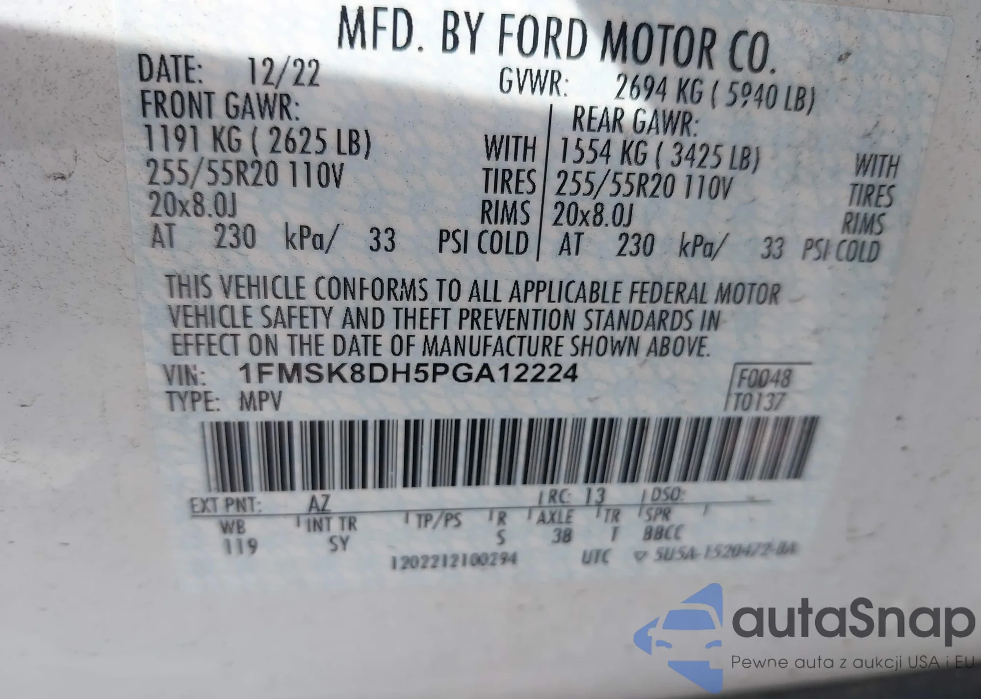 LOT: 42347035 VIN: 1FMSK8DH5PGA12224