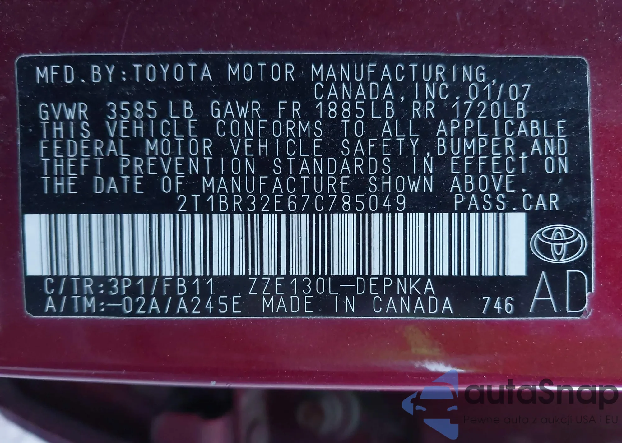 • VIN 2T1BR32E67C785049