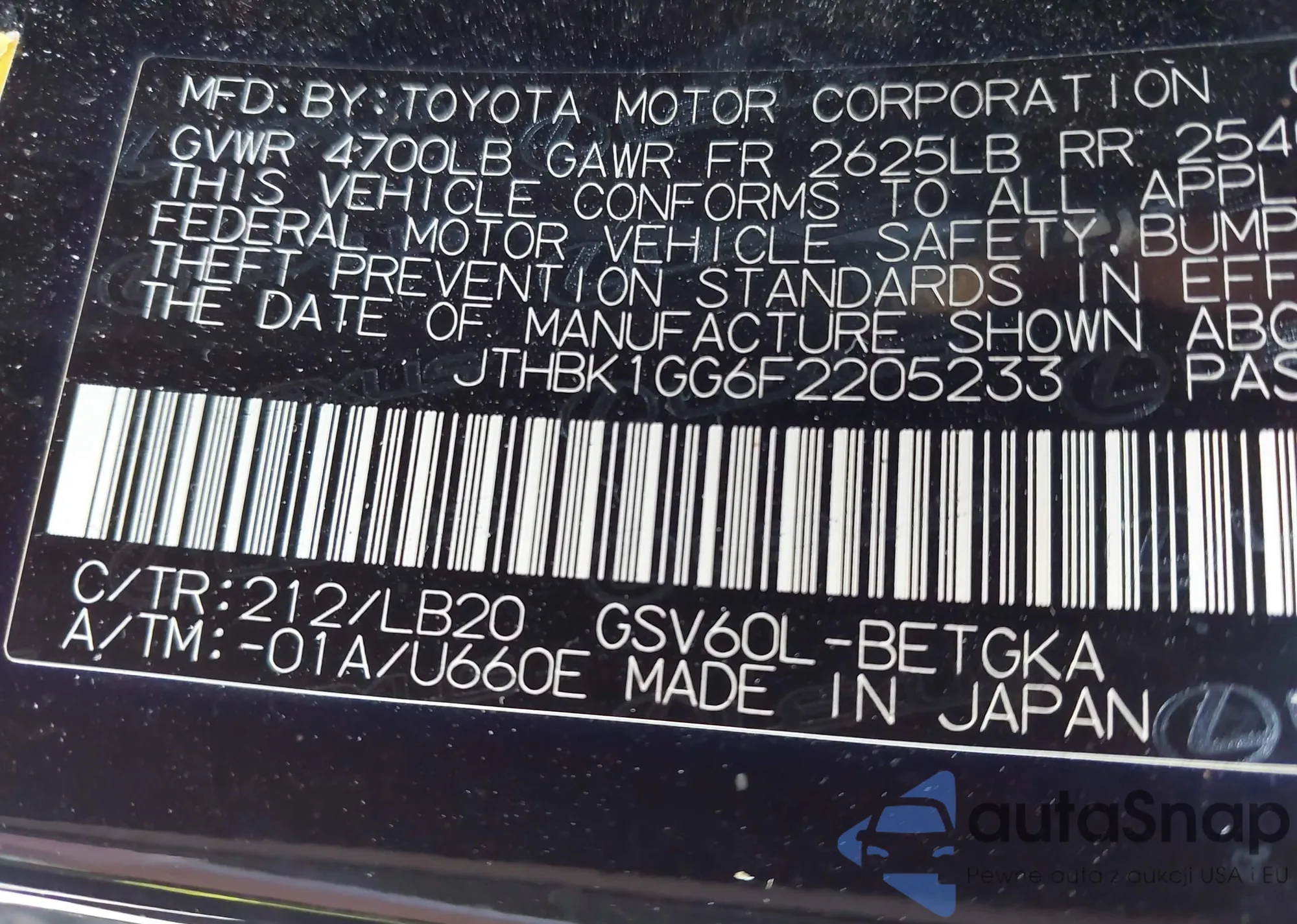 LOT: 43142450 VIN: JTHBK1GG6F2205233