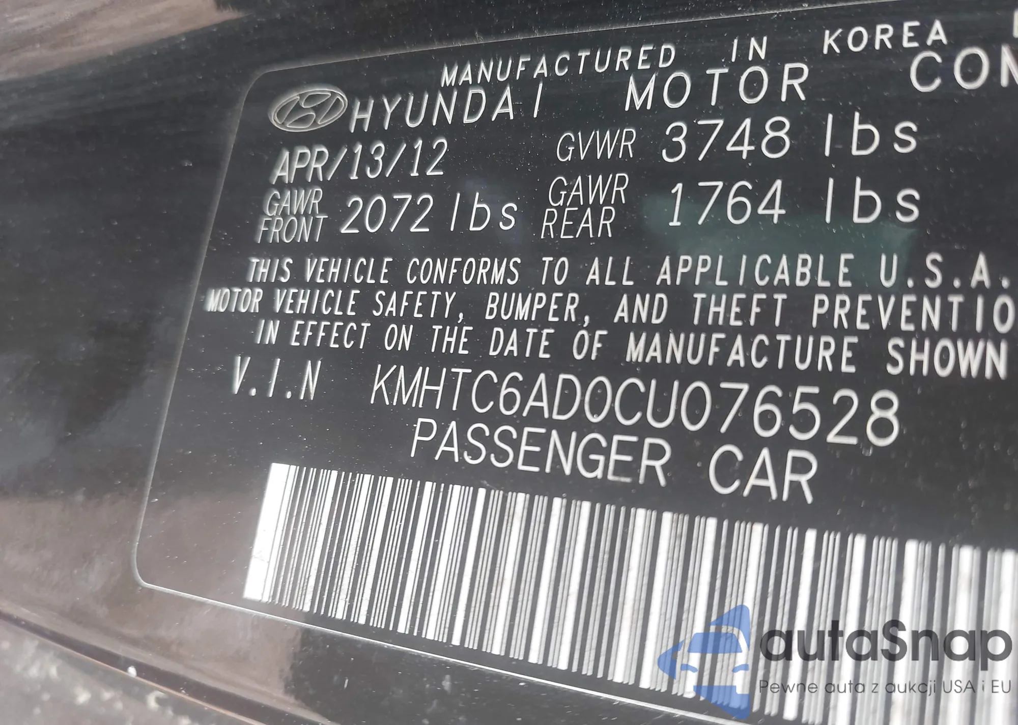 LOT: 42651736 VIN: KMHTC6AD0CU076528