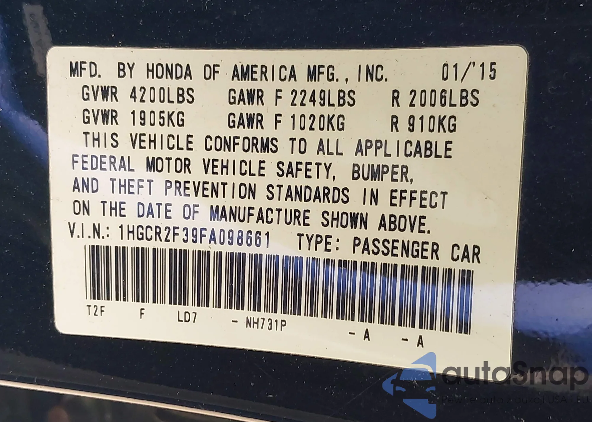 • VIN 1HGCR2F39FA098661