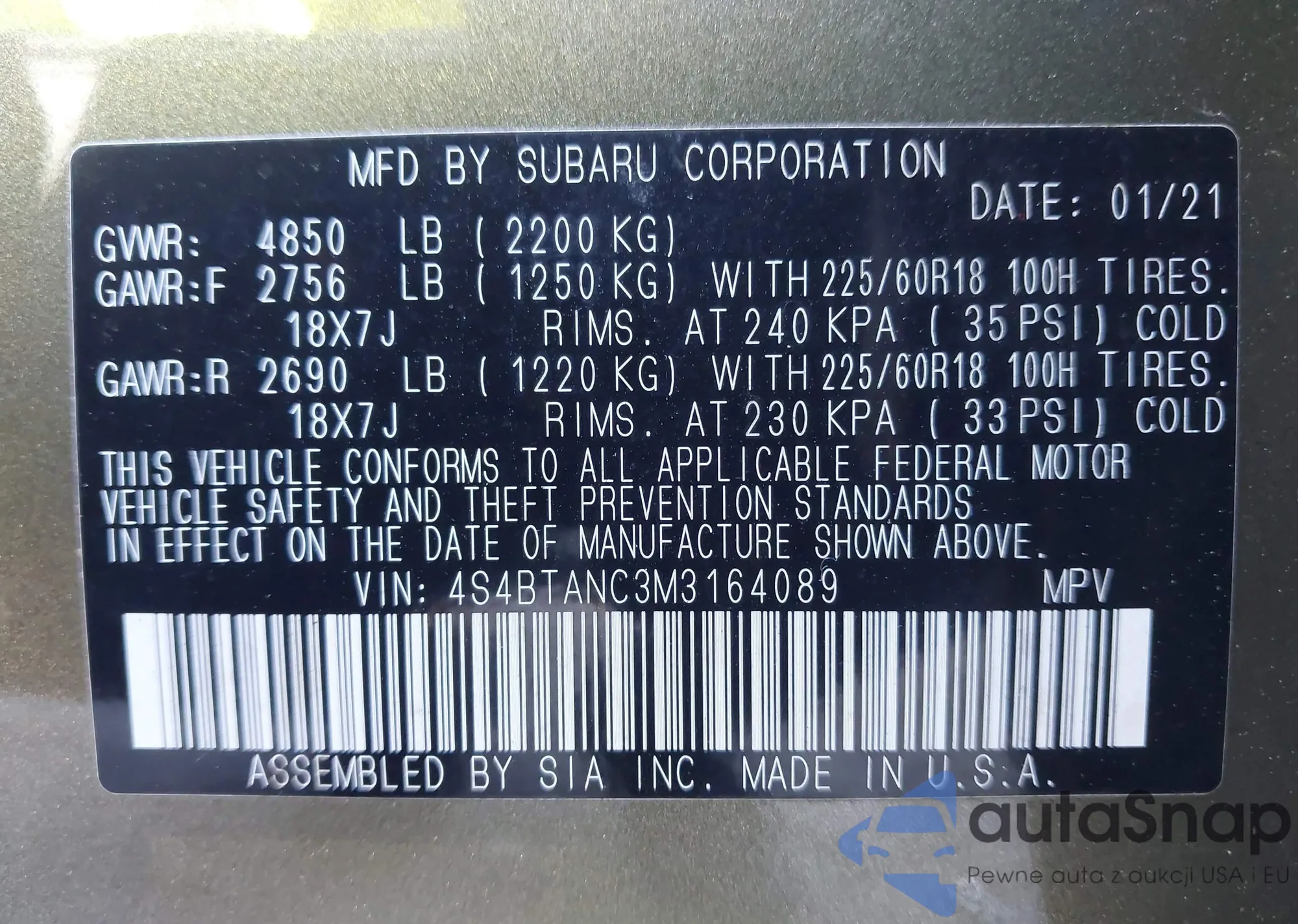 LOT: 42558309 VIN: 4S4BTANC3M3164089
