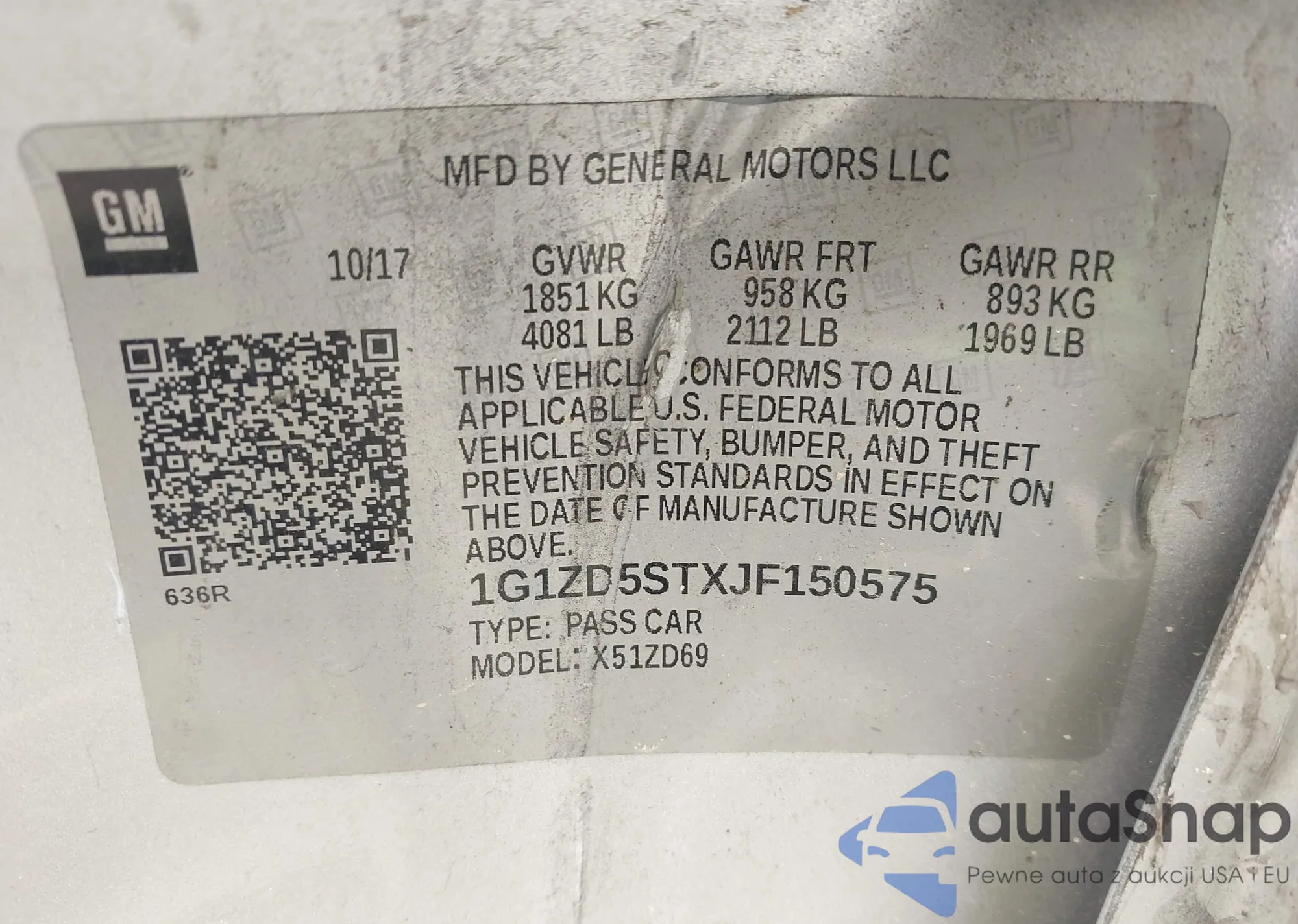 LOT: 42709885 VIN: 1G1ZD5STXJF150575