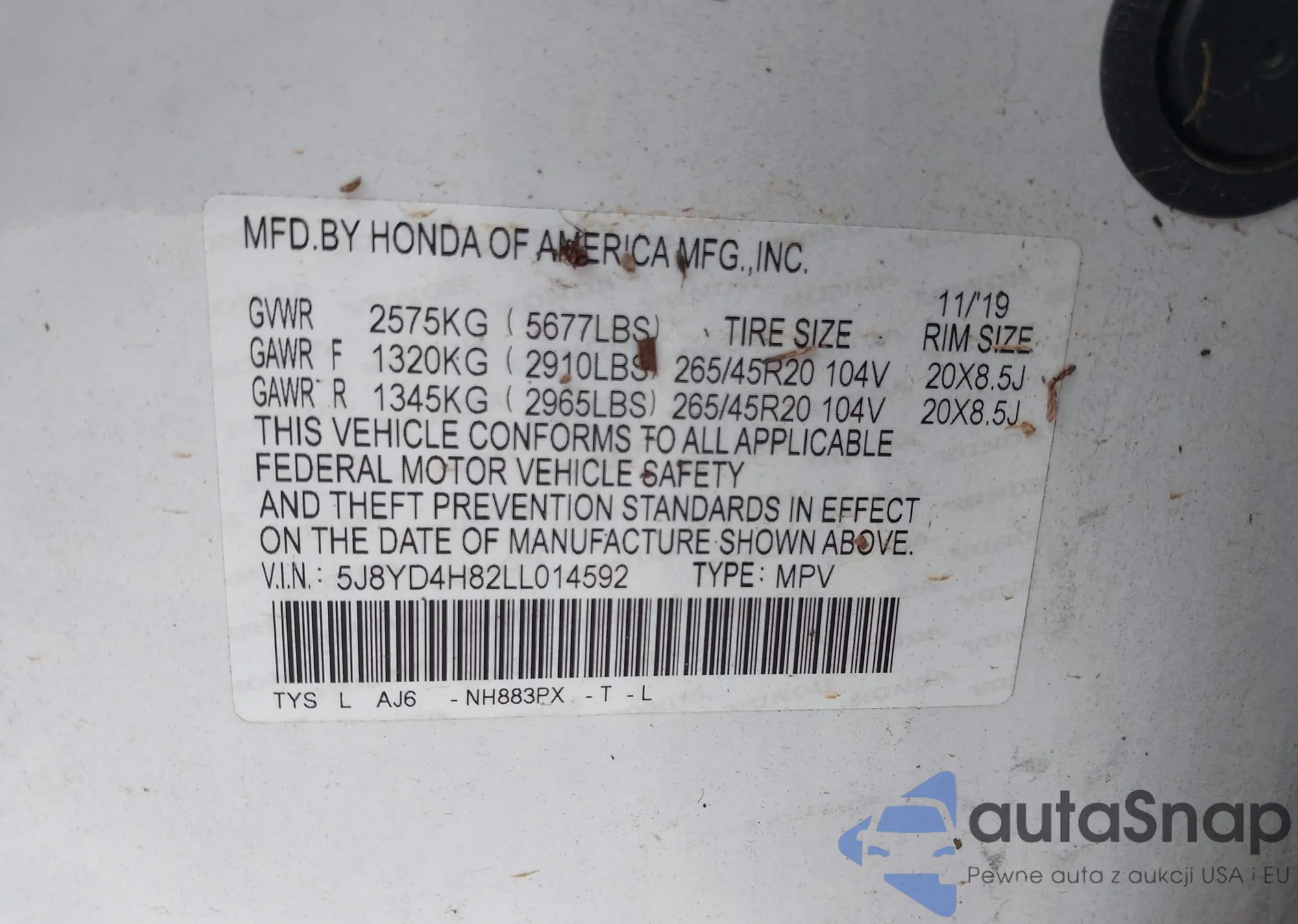 • VIN 5J6RE38739L020339