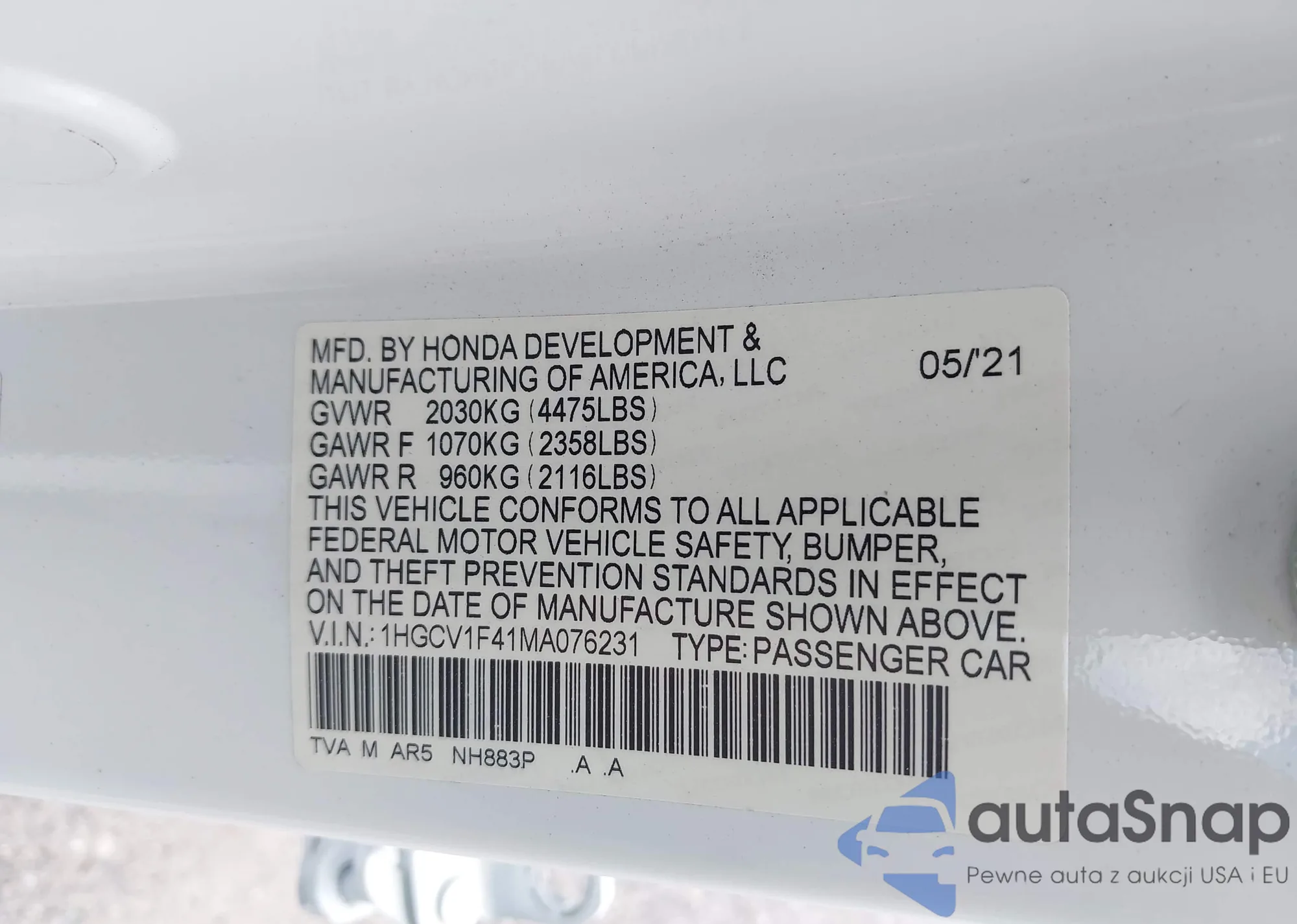 LOT: 43113293 VIN: 1HGCR2F39FA098661