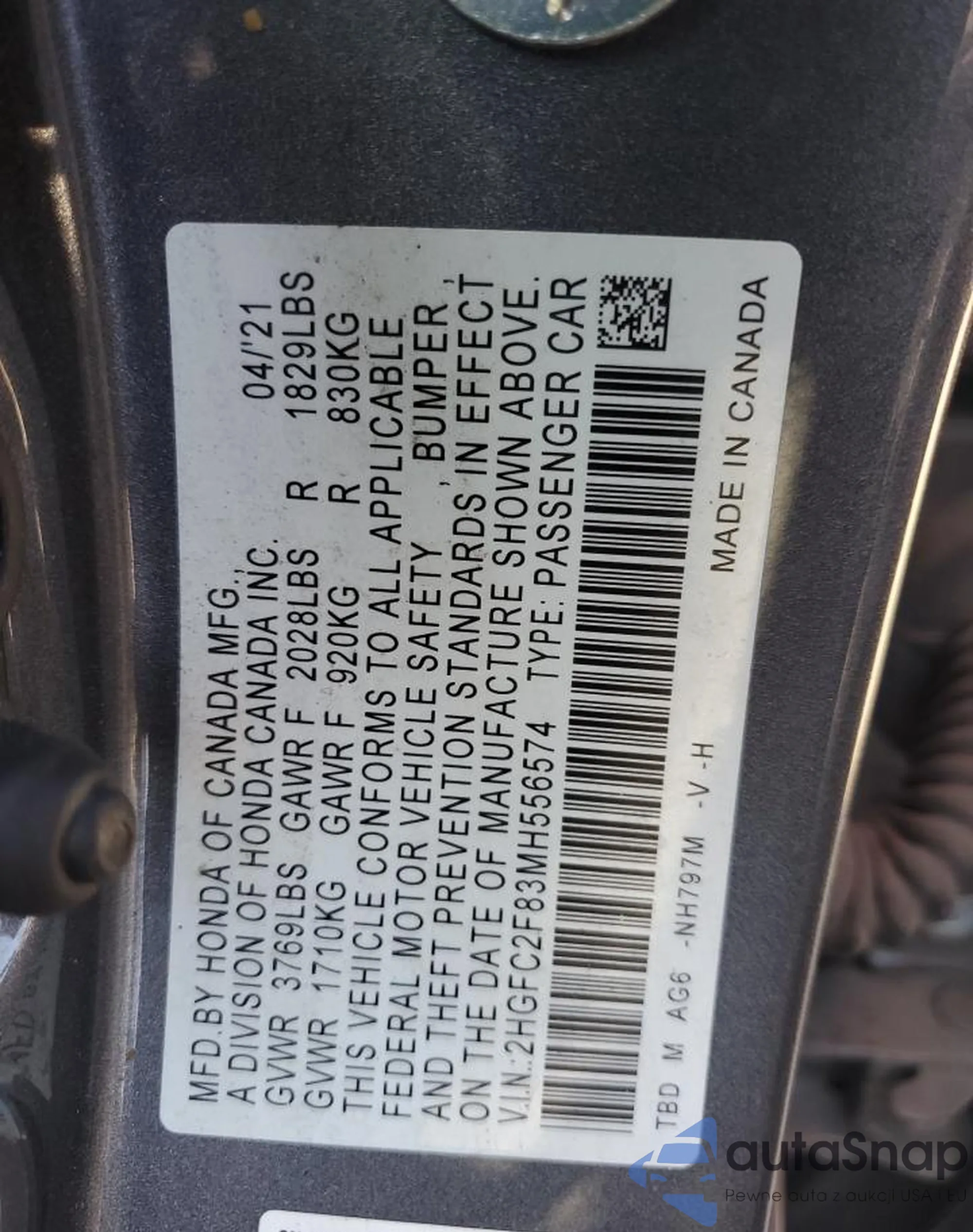 LOT: 69361305 VIN: 2HGFC2F83MH556574