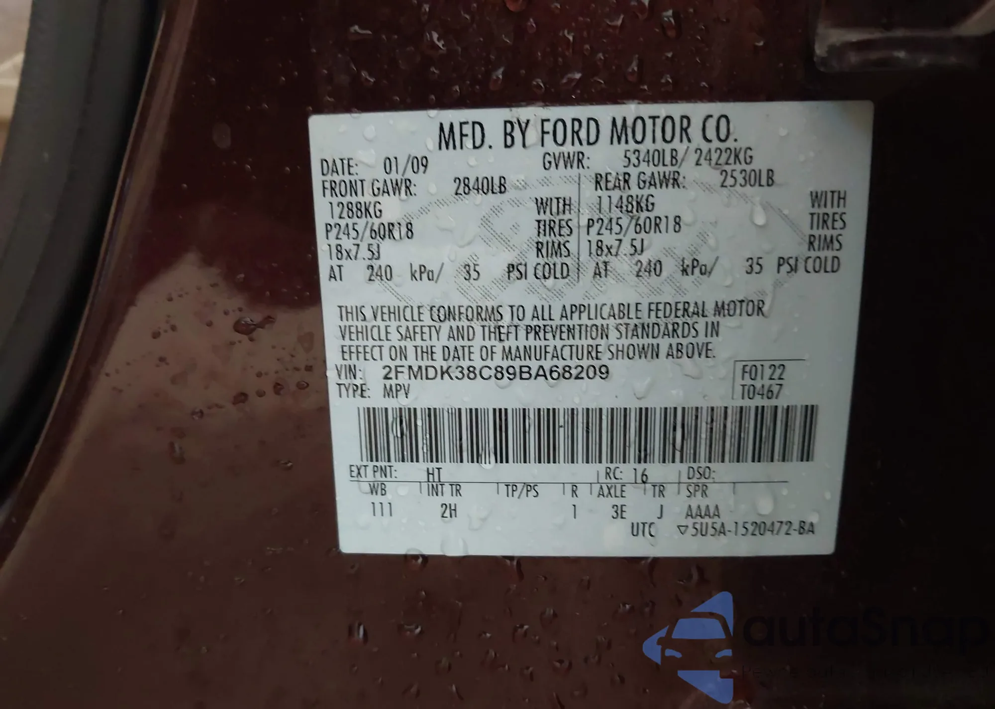 • VIN 2FMDK38C89BA68209