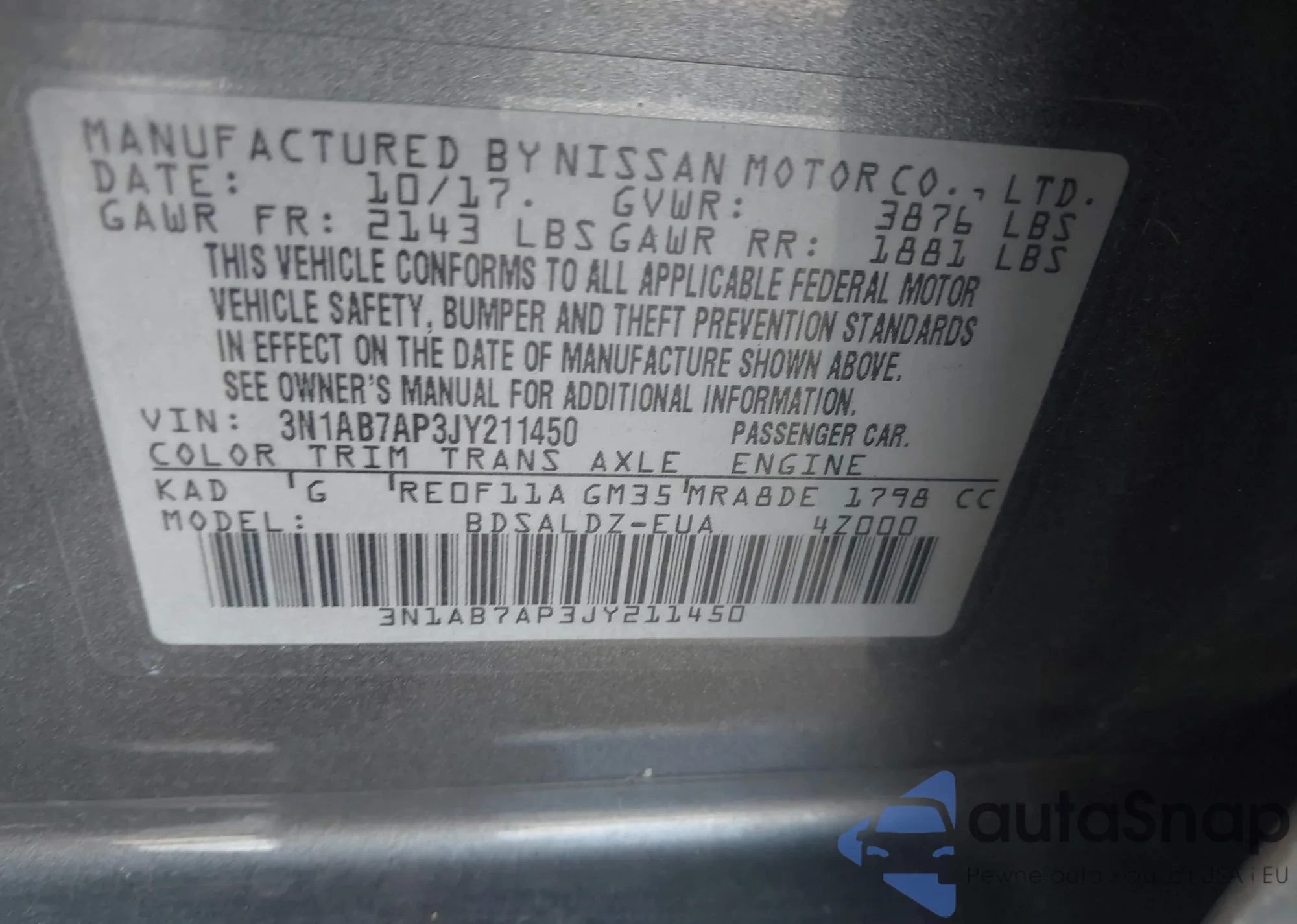 • VIN 3N1AB7AP3JY211450