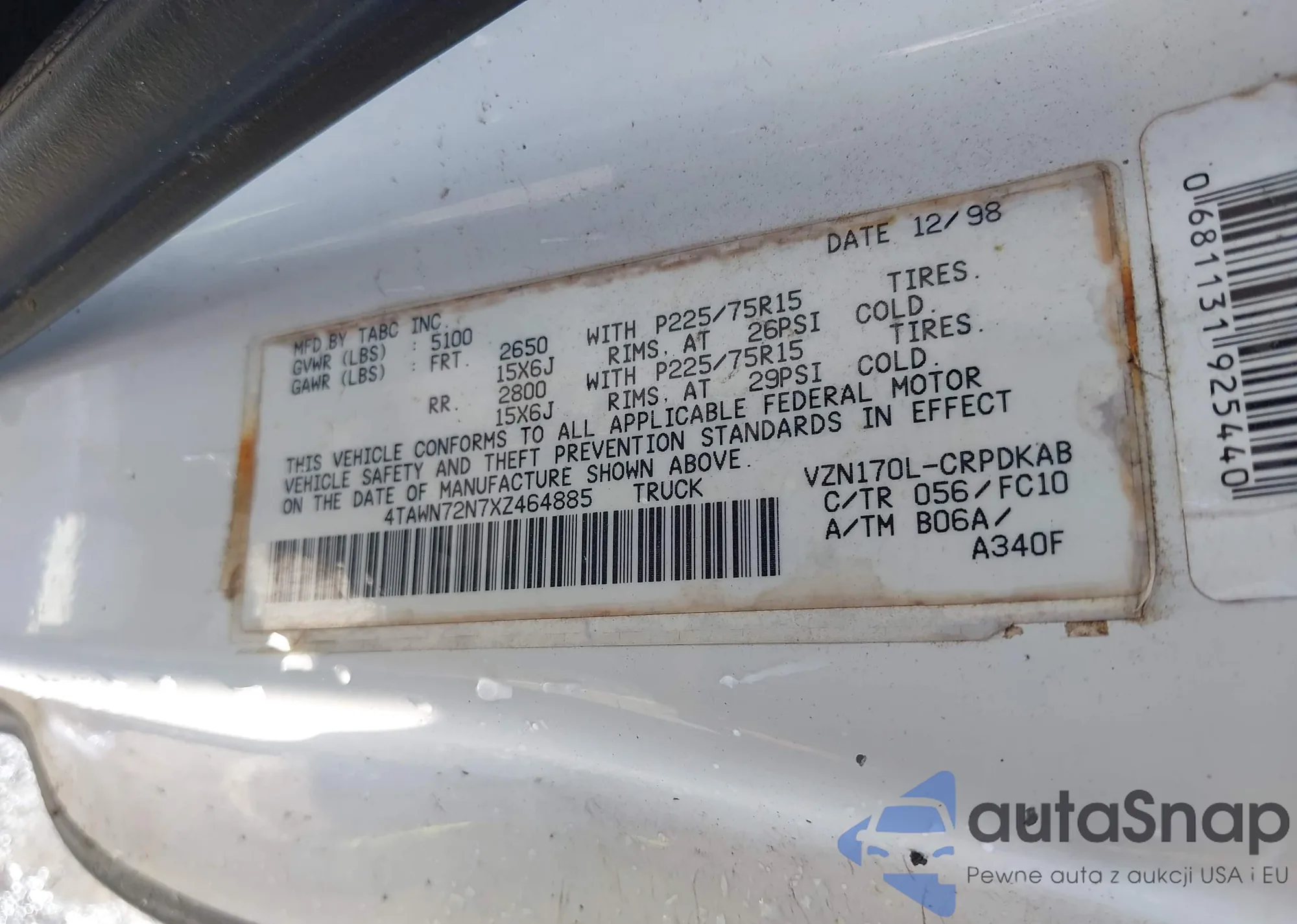 1999 Toyota Tacoma z USA, uszkodzony, nr VIN 4TAWN72N7XZ464885