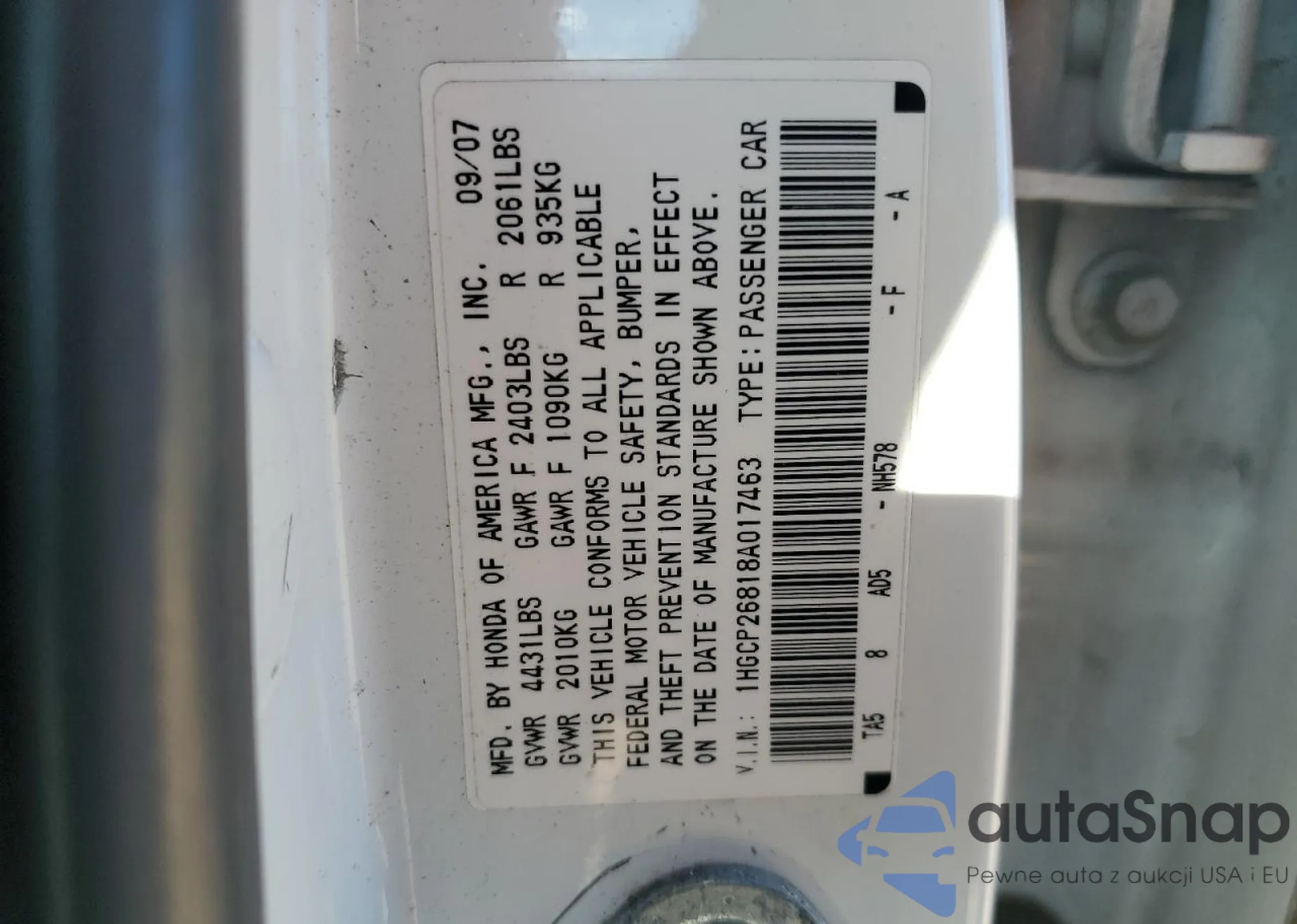 LOT: 70559905 VIN: 1HGCP26818A017463
