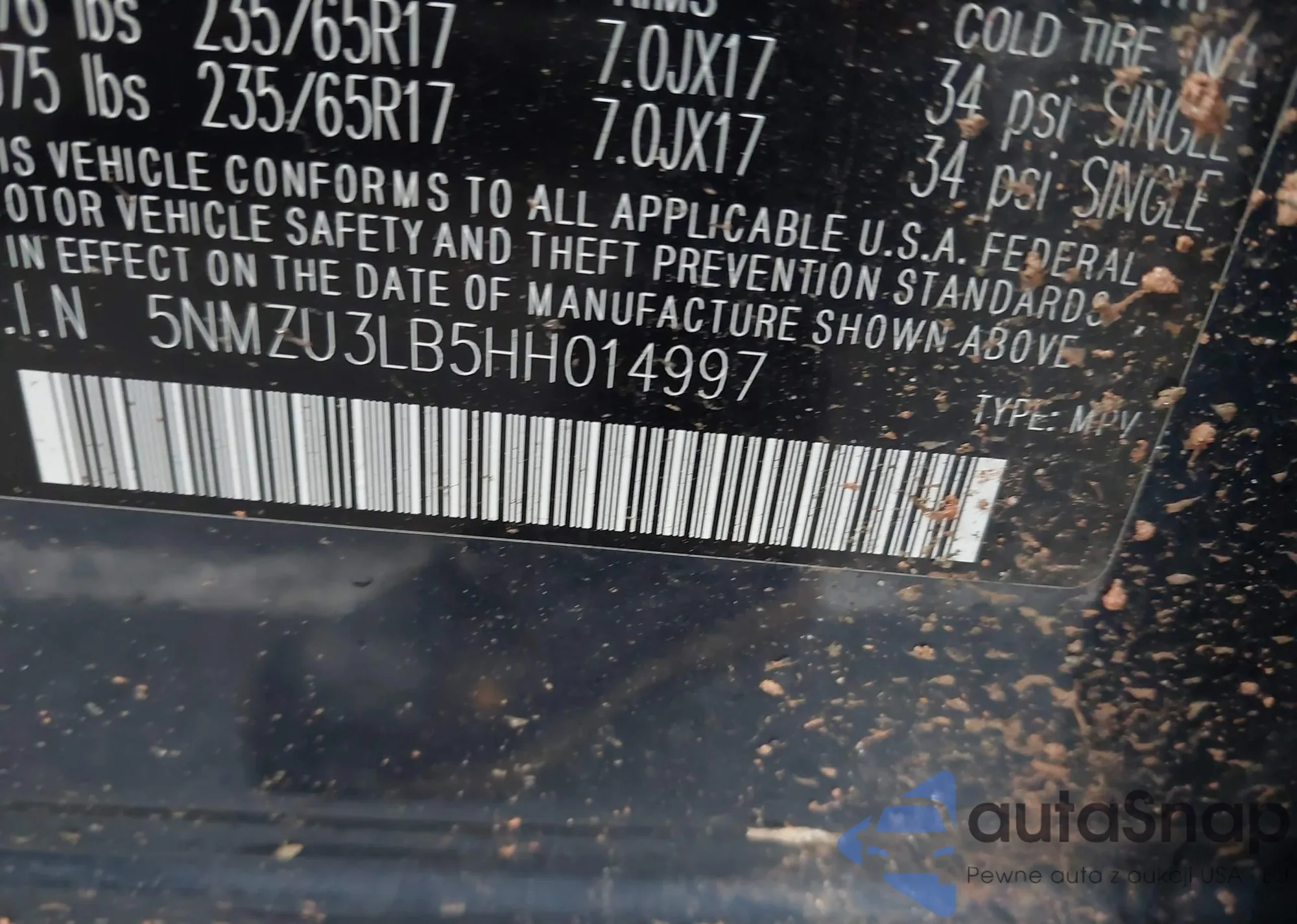 • VIN 5NMZU3LB5HH014997