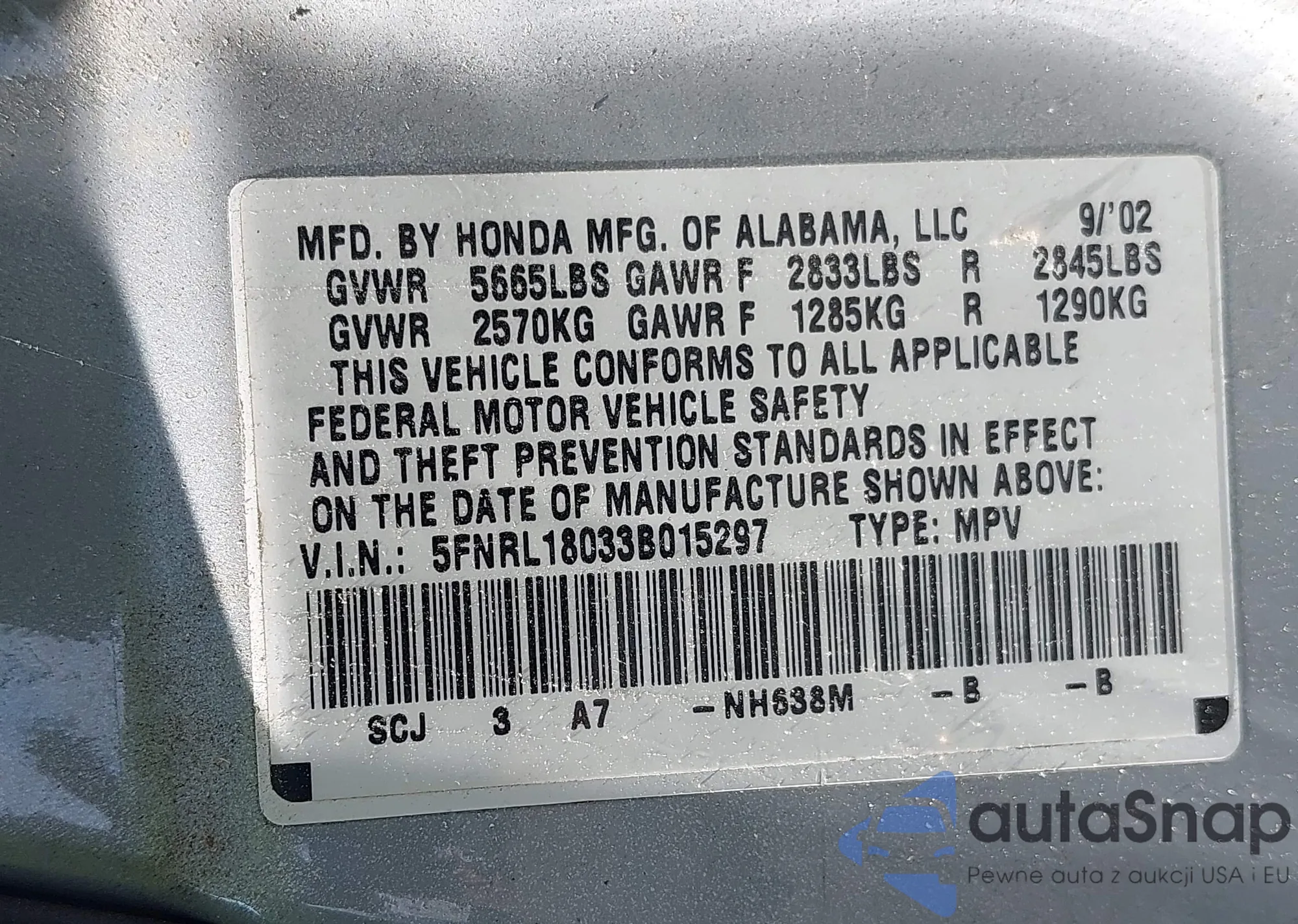 • VIN 5FNRL18033B015297