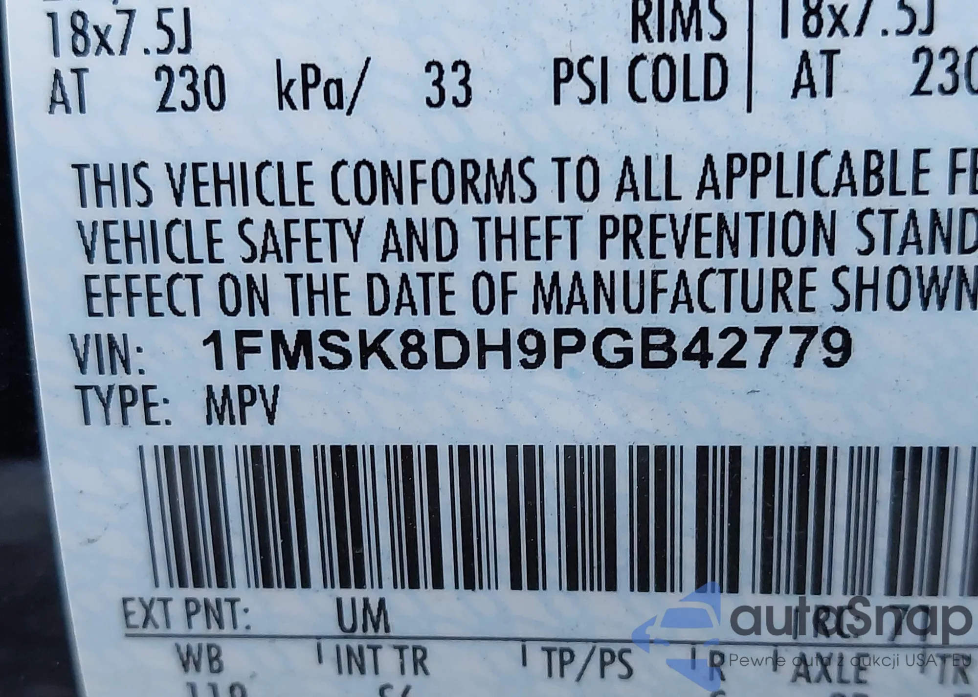 LOT: 43068855 VIN: 1FMSK8DH9PGB42779