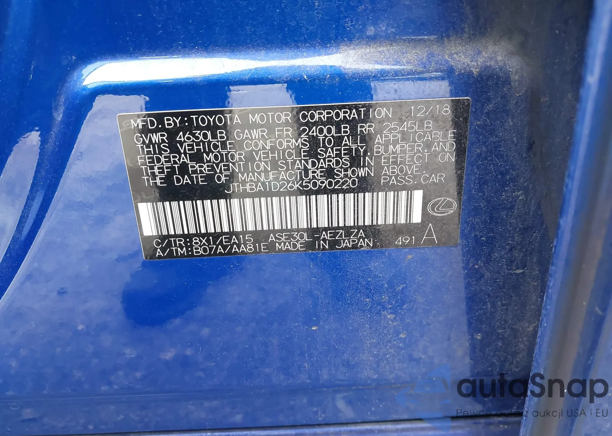 LOT: 43070347 VIN: JTHBA1D26K5090220