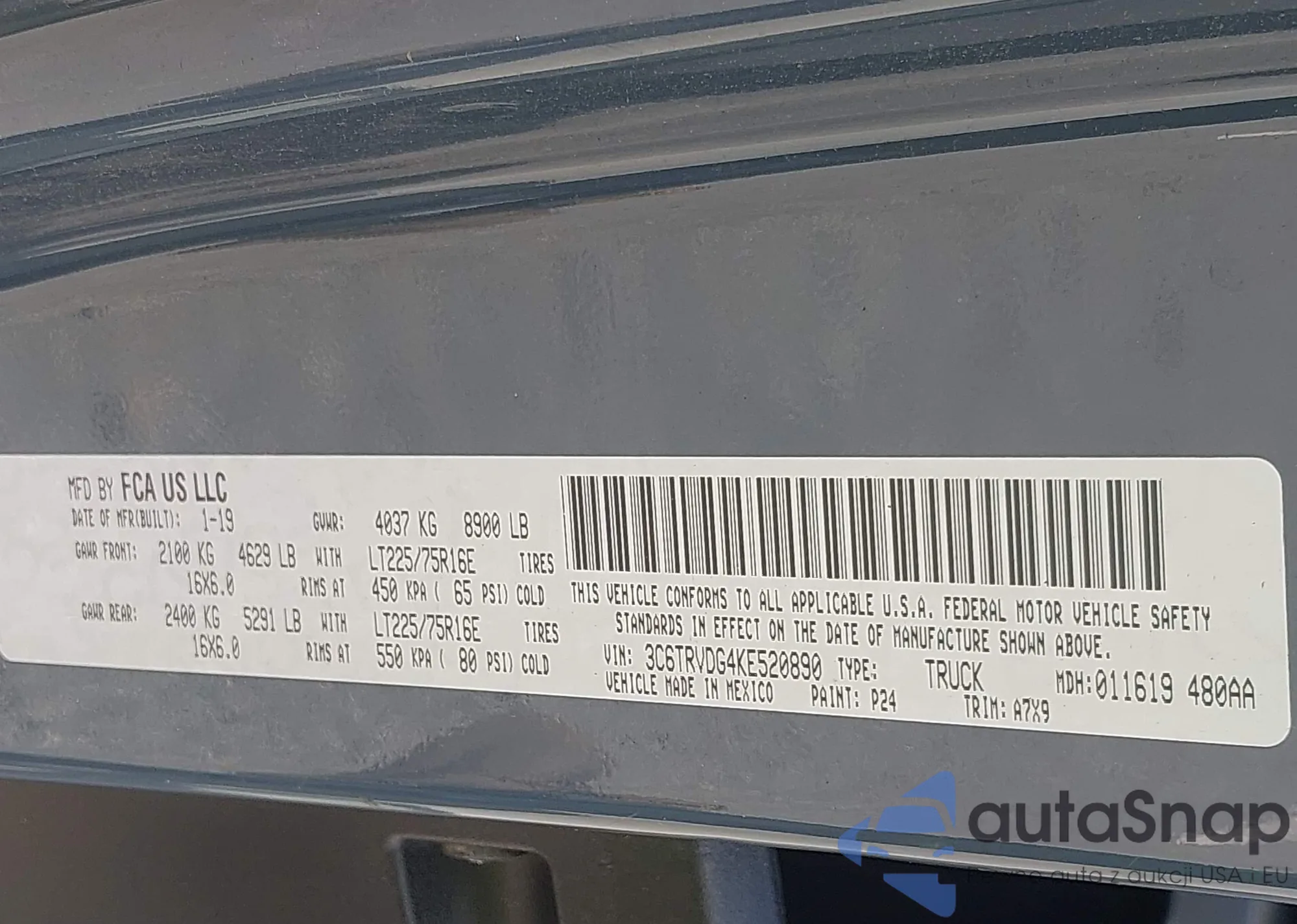 • VIN 3C6TRVDG4KE520890