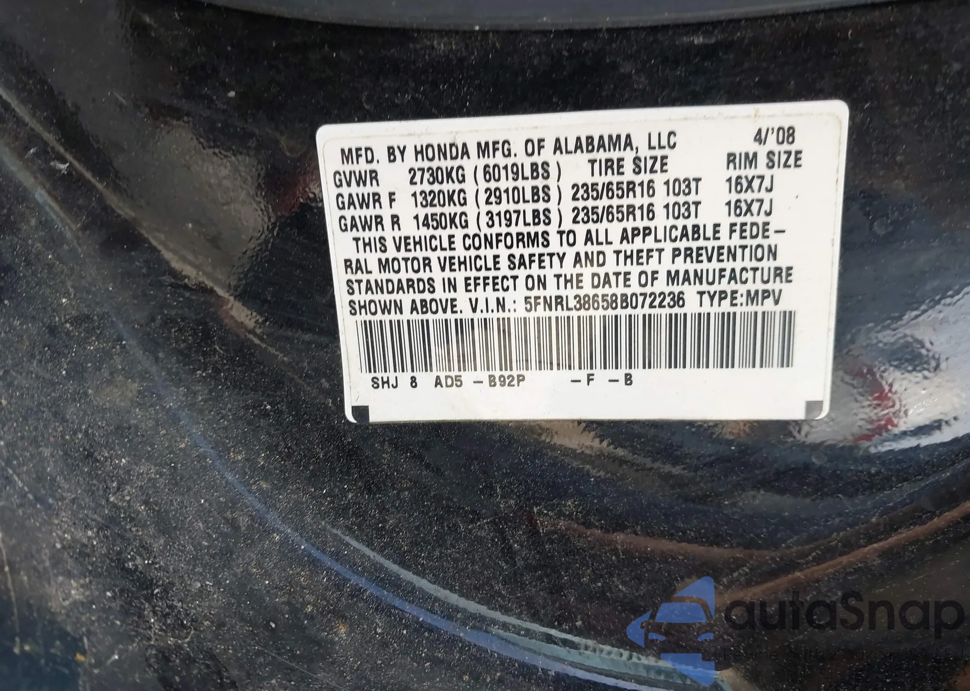 • VIN 5FNRL38658B072236