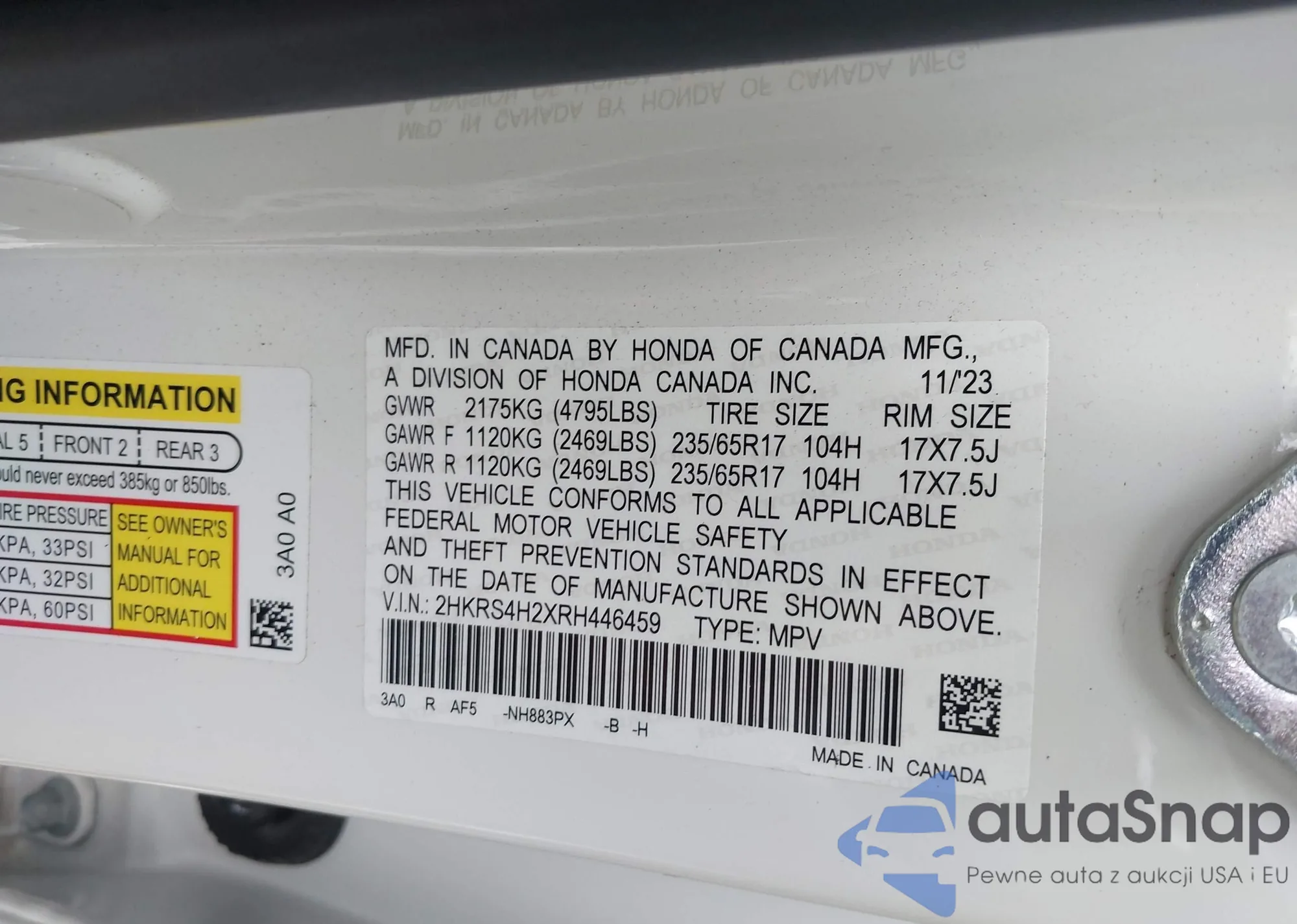 • VIN 2HKRS4H2XRH446459