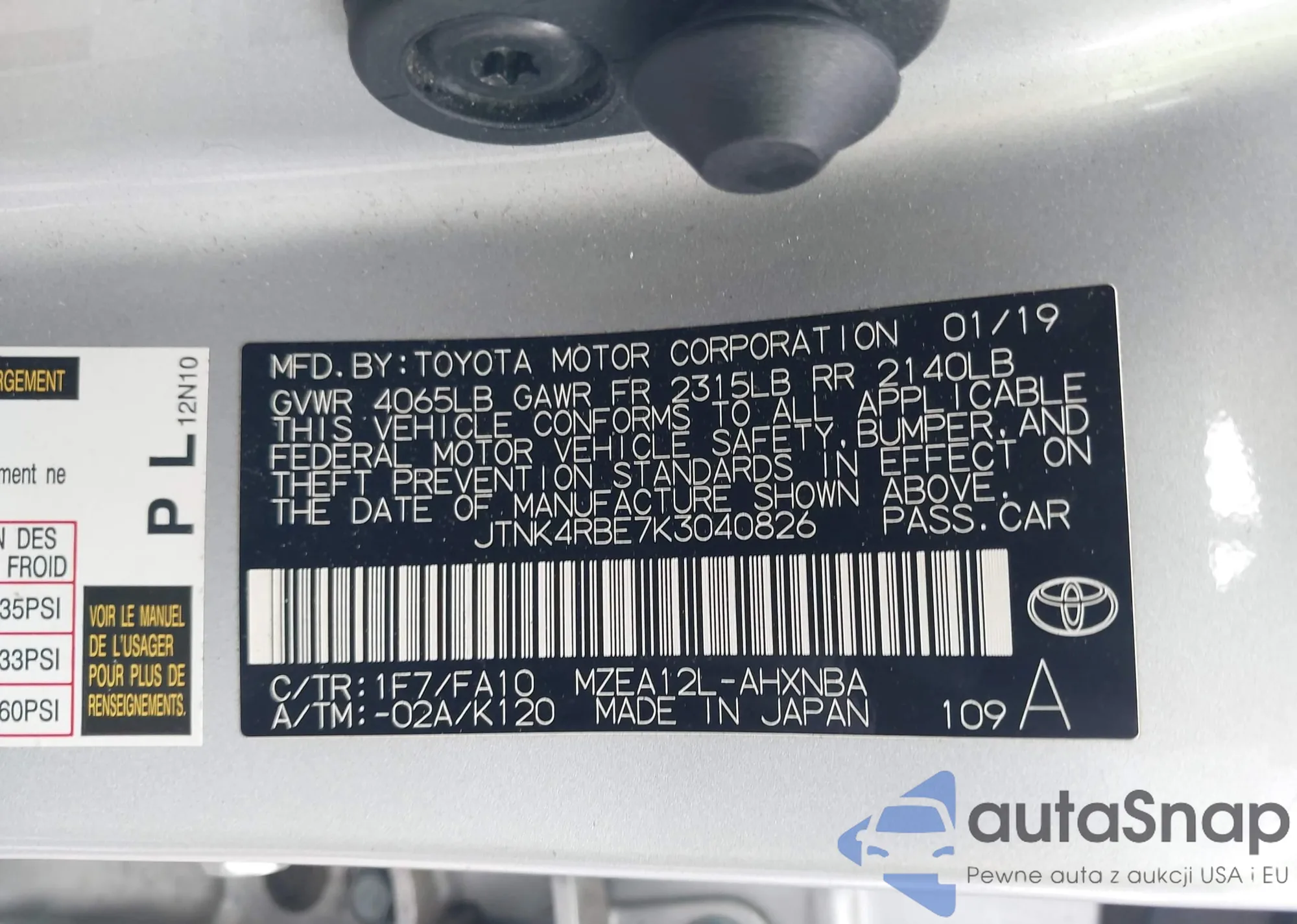 LOT: 42734243 VIN: JTNK4RBE7K3040826