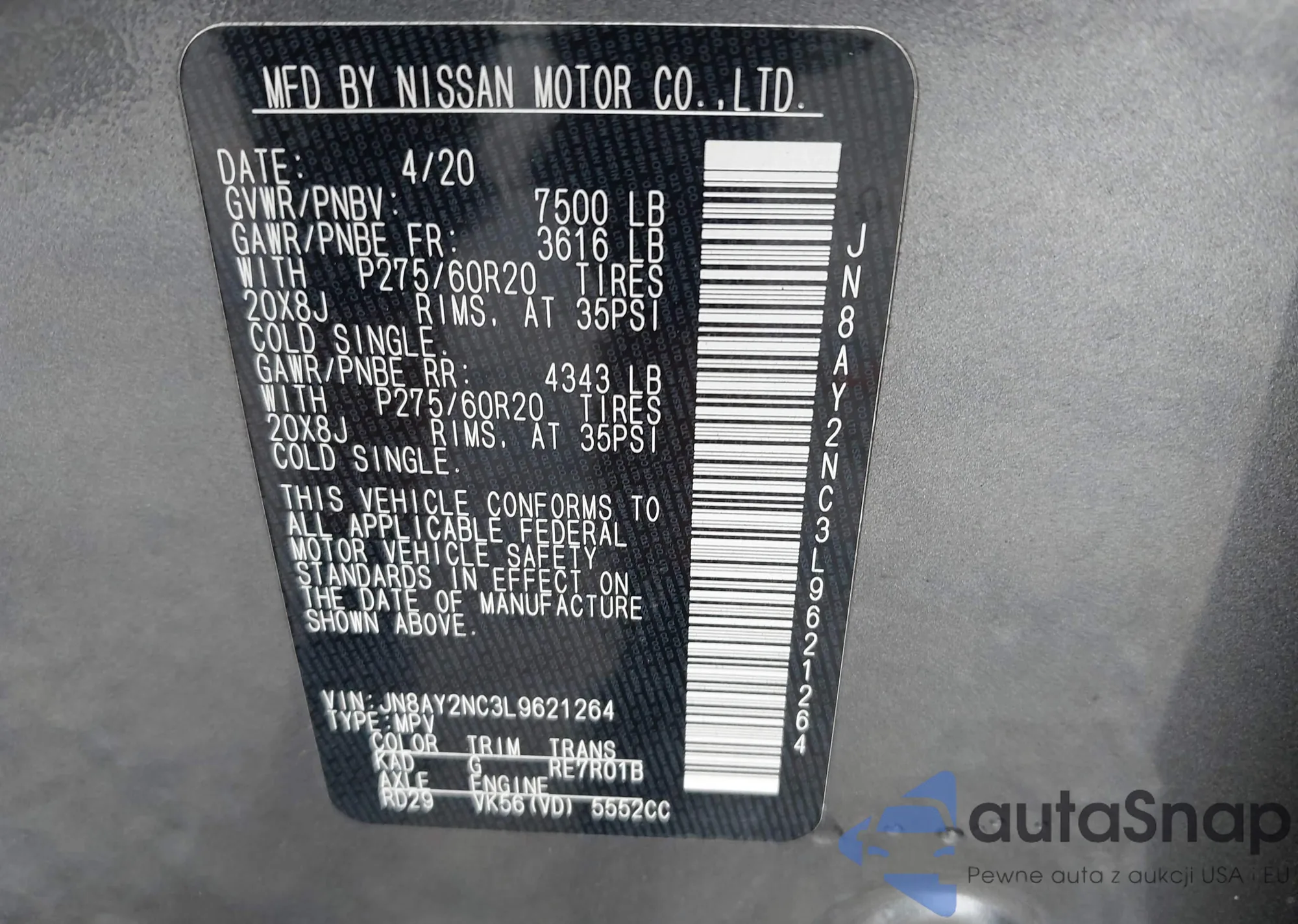 LOT: 42803788 VIN: JN8AY2NC3L9621264