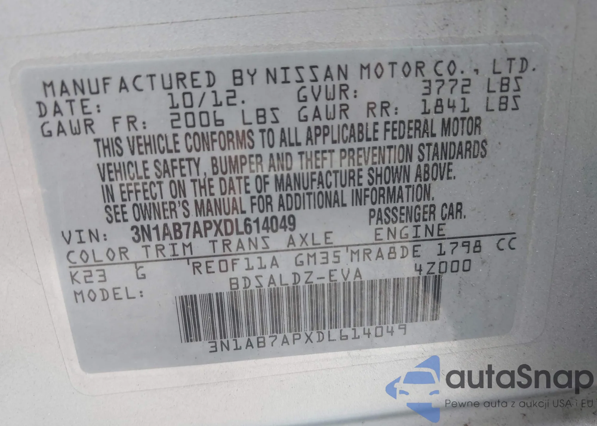 • VIN 3N1AB7APXDL614049