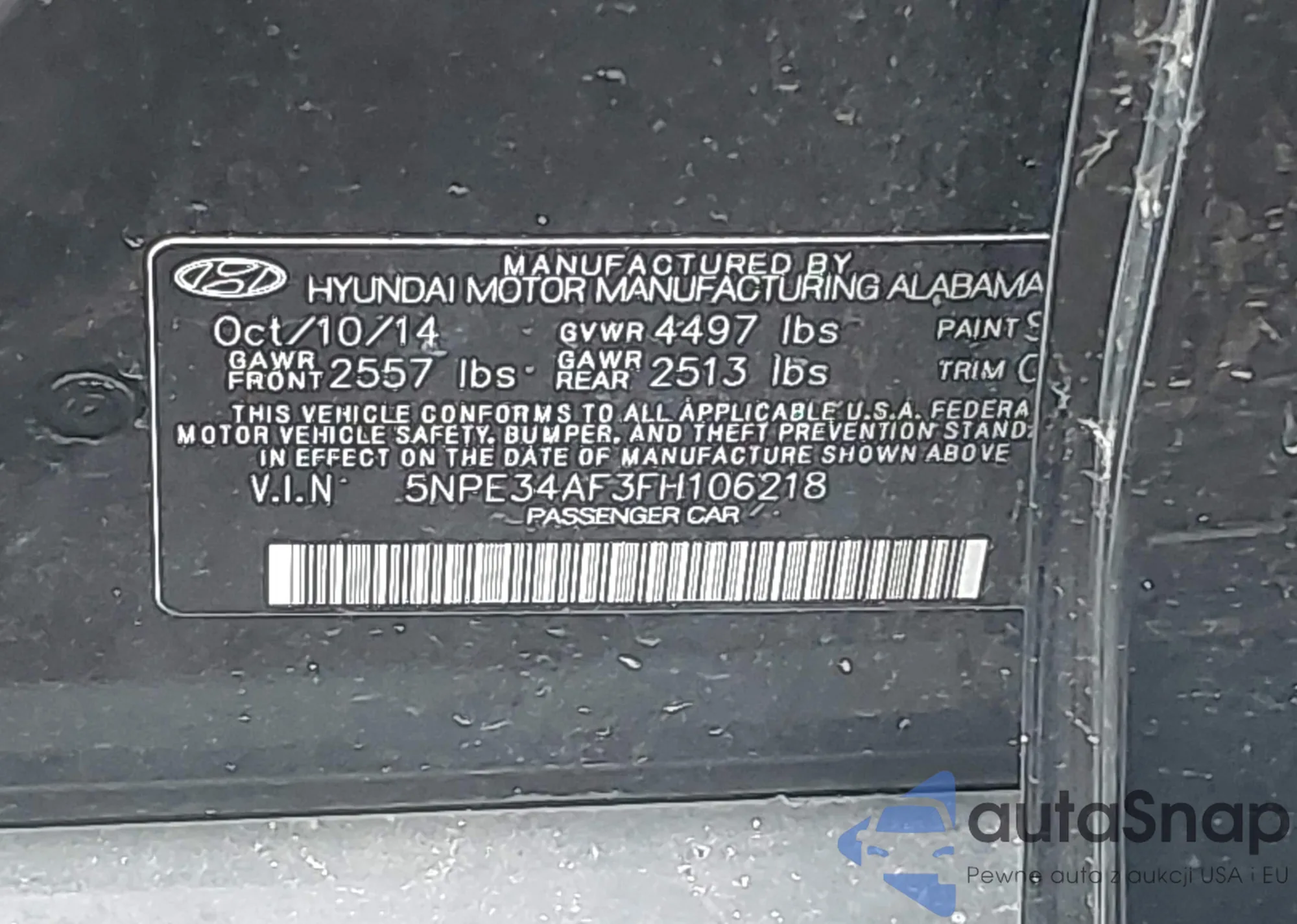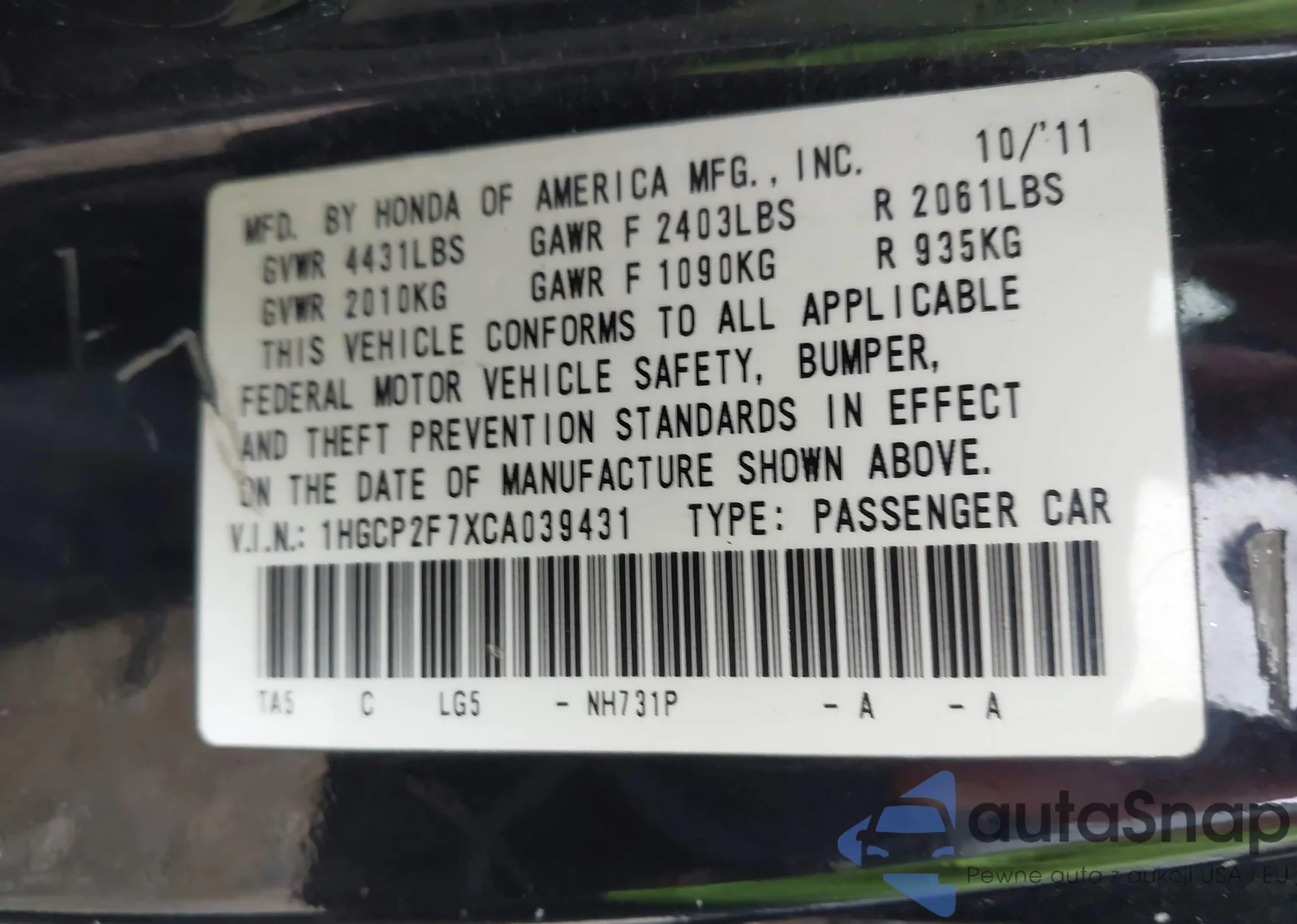 LOT: 43038015 VIN: 1HGCP2F7XCA039431