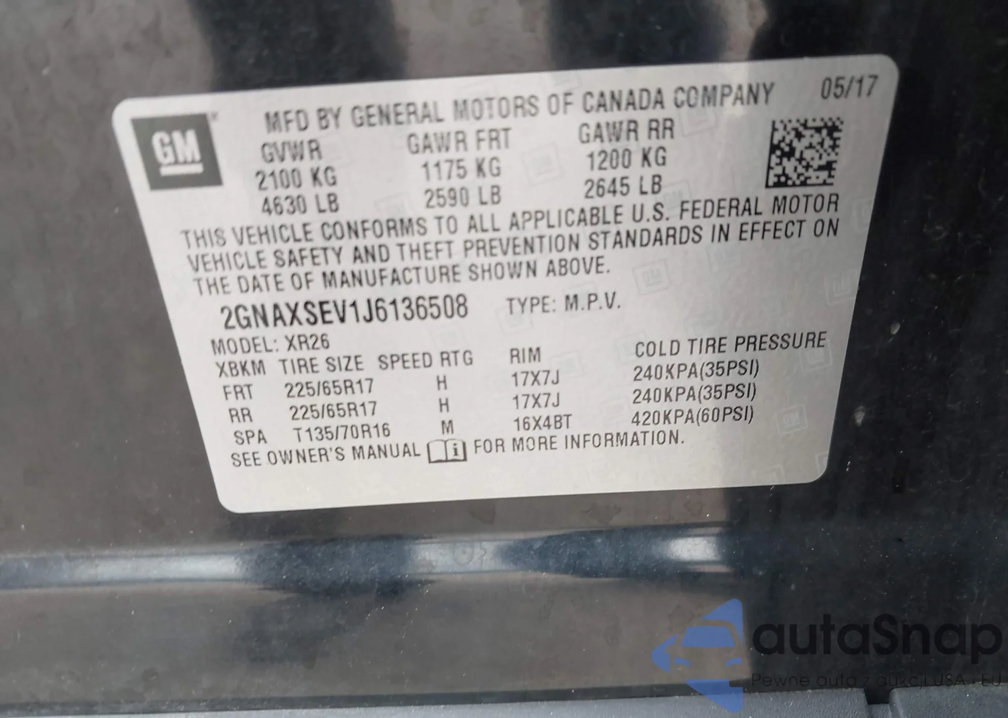 LOT: 43035935 VIN: 2GNAXSEV1J6136508