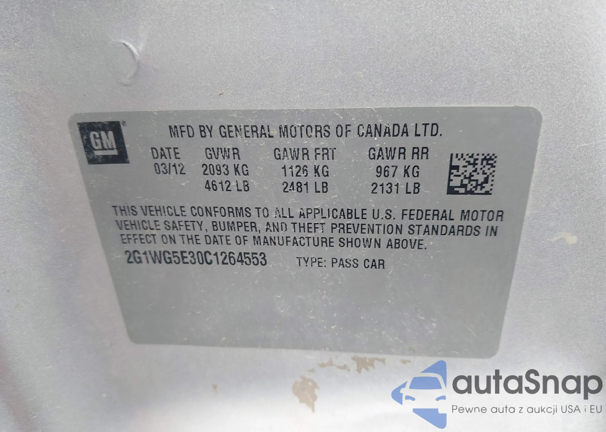 LOT: 43038612 VIN: 2G1WG5E30C1264553