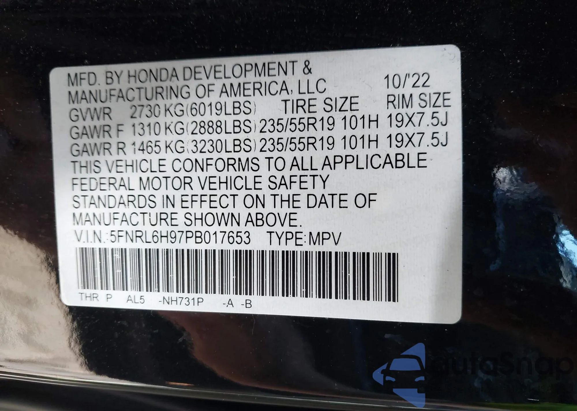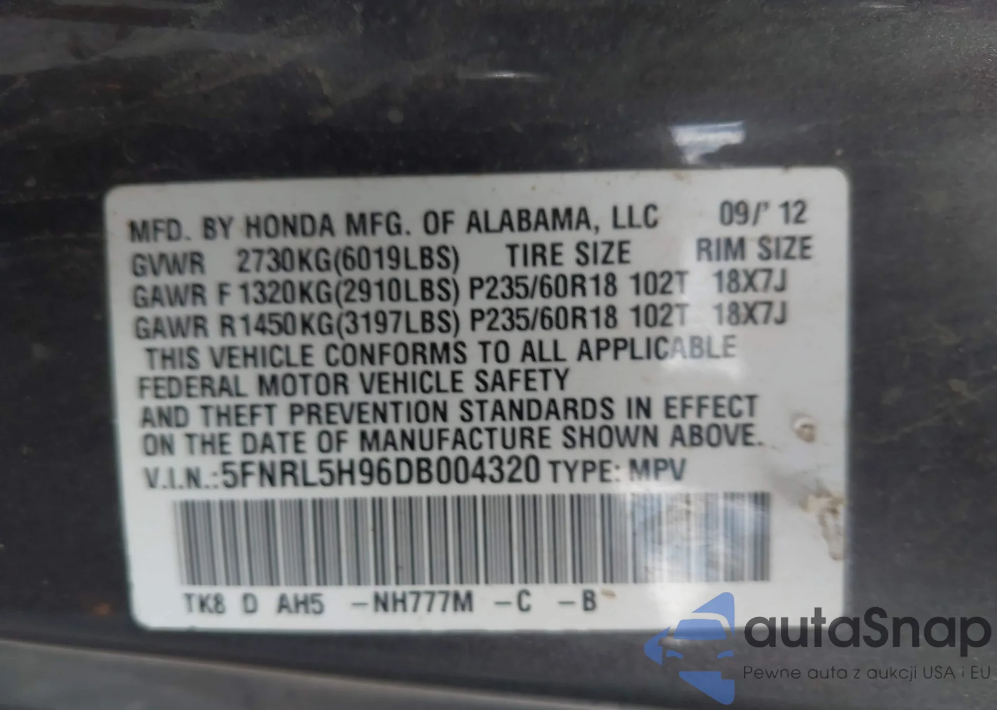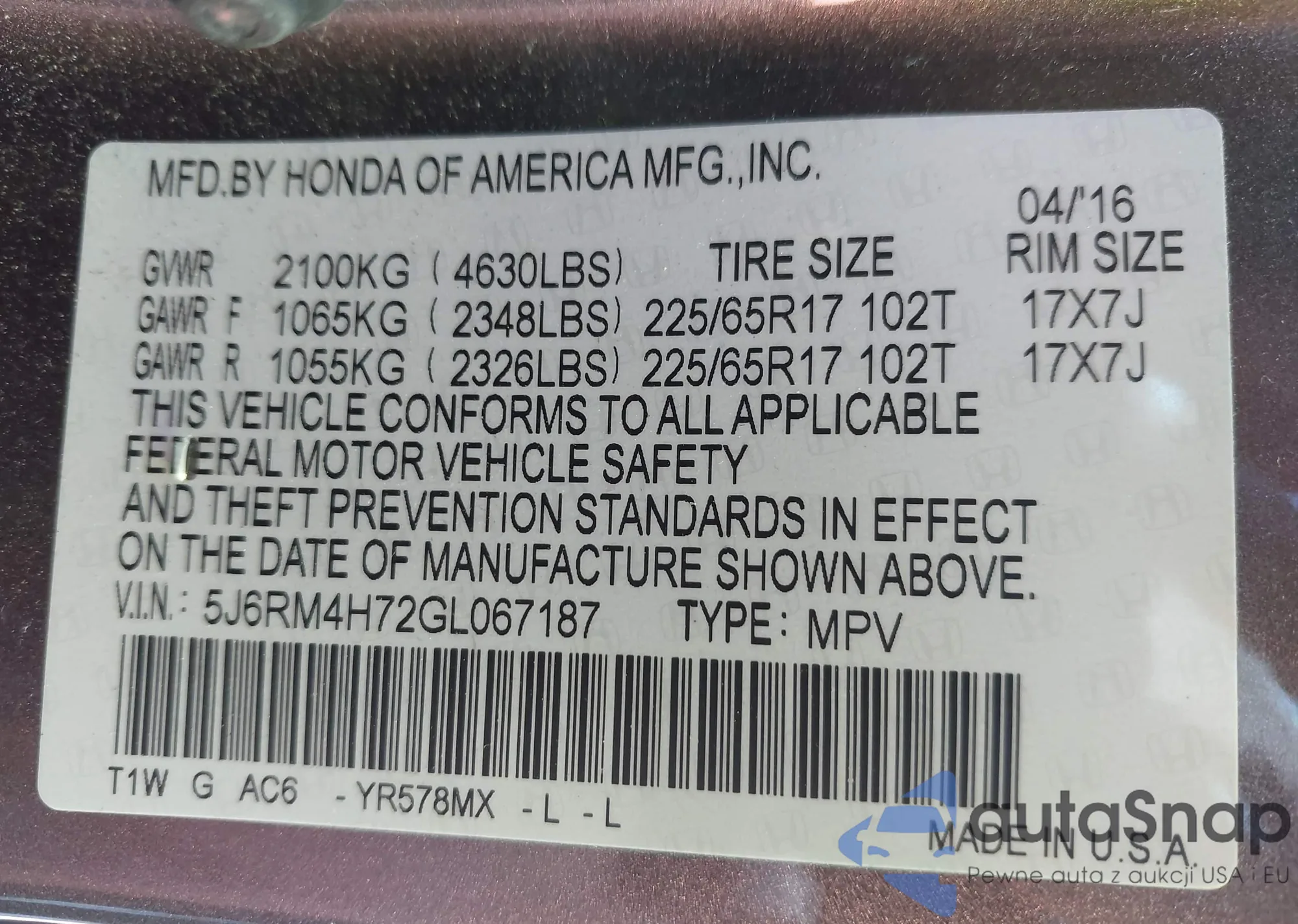 • VIN 5J6RM4H72GL067187
